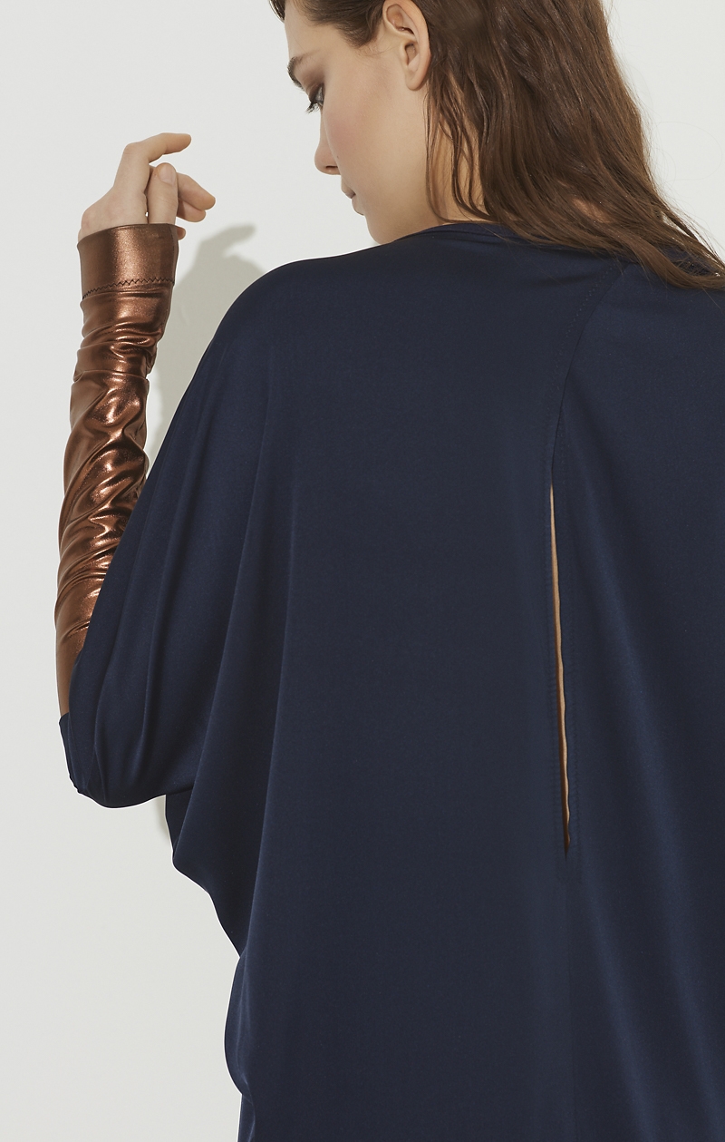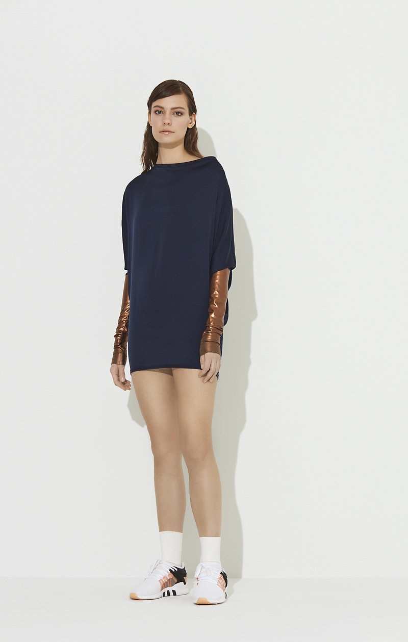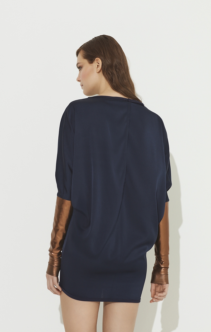 An oversized short cap-sleeved with a Silk Satinette dress with large crew neckline and contrasting metallic tube sleeves fitted at hem.