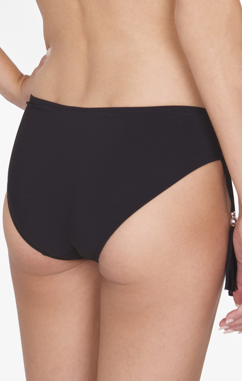This regular rise bikini bottom is incredibly versatile: the sliding strings on the side can be drawn to adjust the height of the waist and of the leg line. The strings are trimmed with lovely metallic accents. This timeless bikini bottom was designed and made in Canada and can easily be matched with any bikini top.