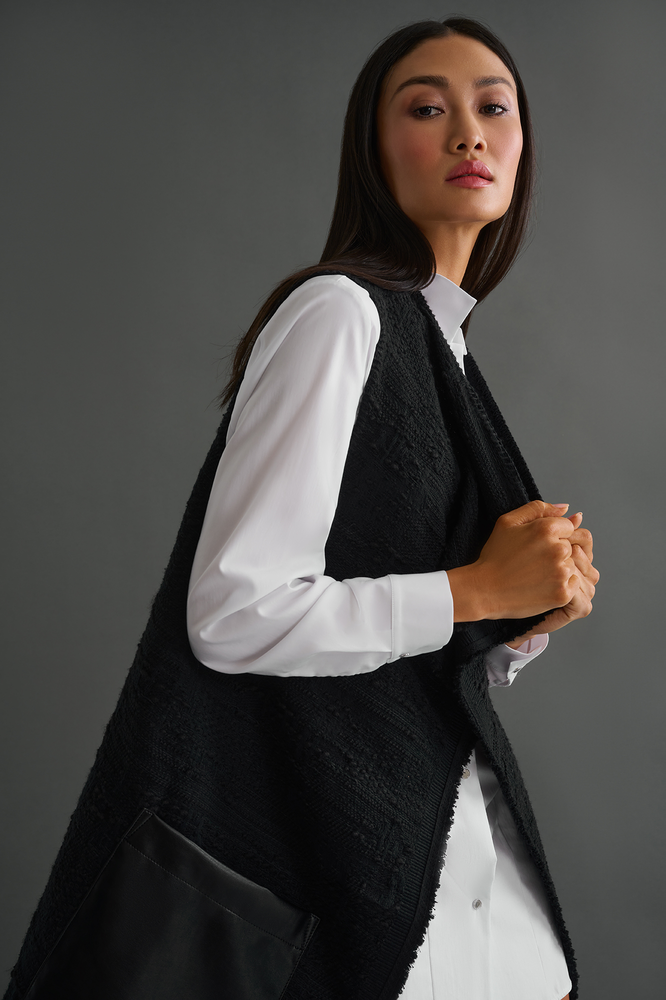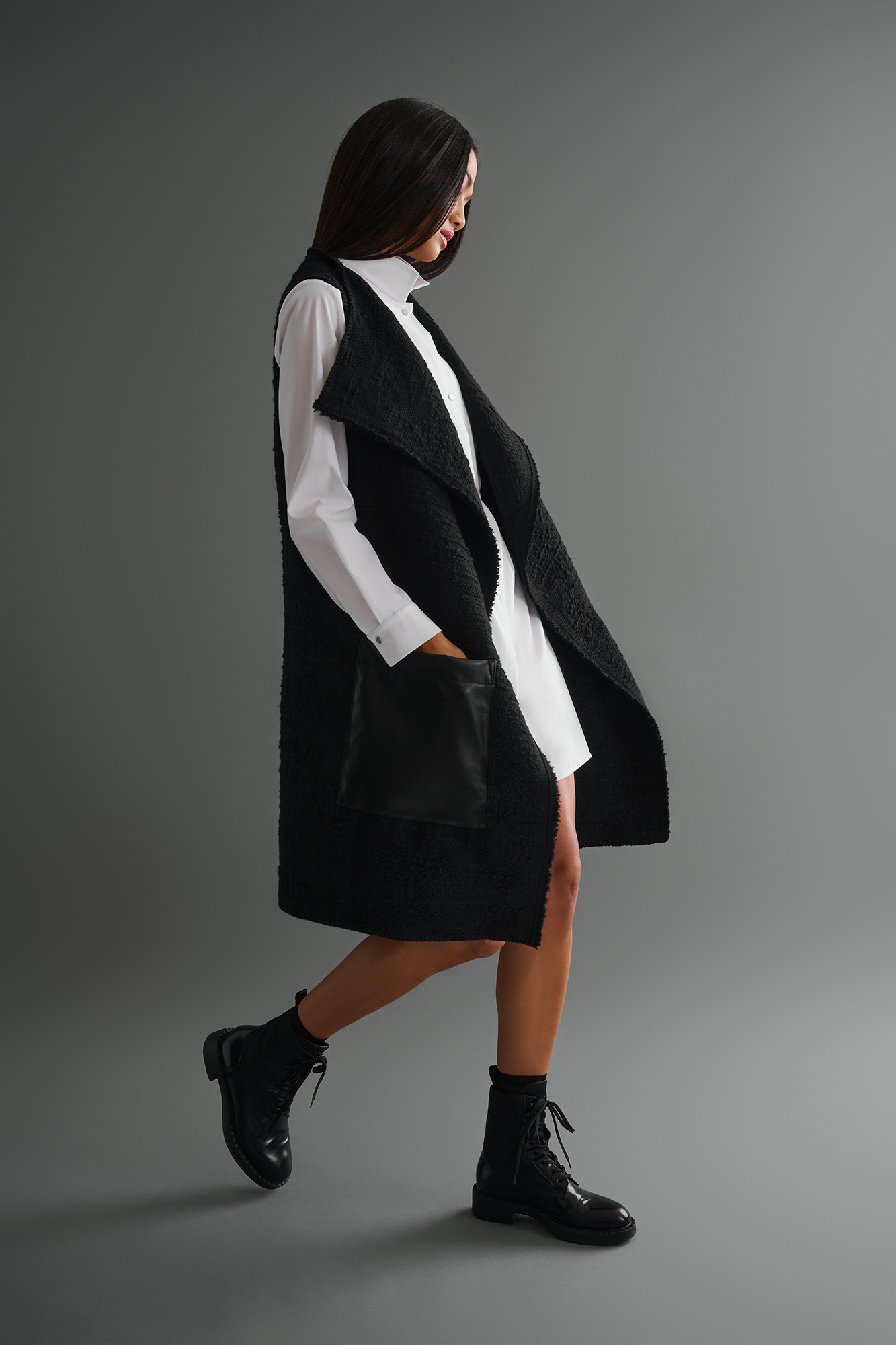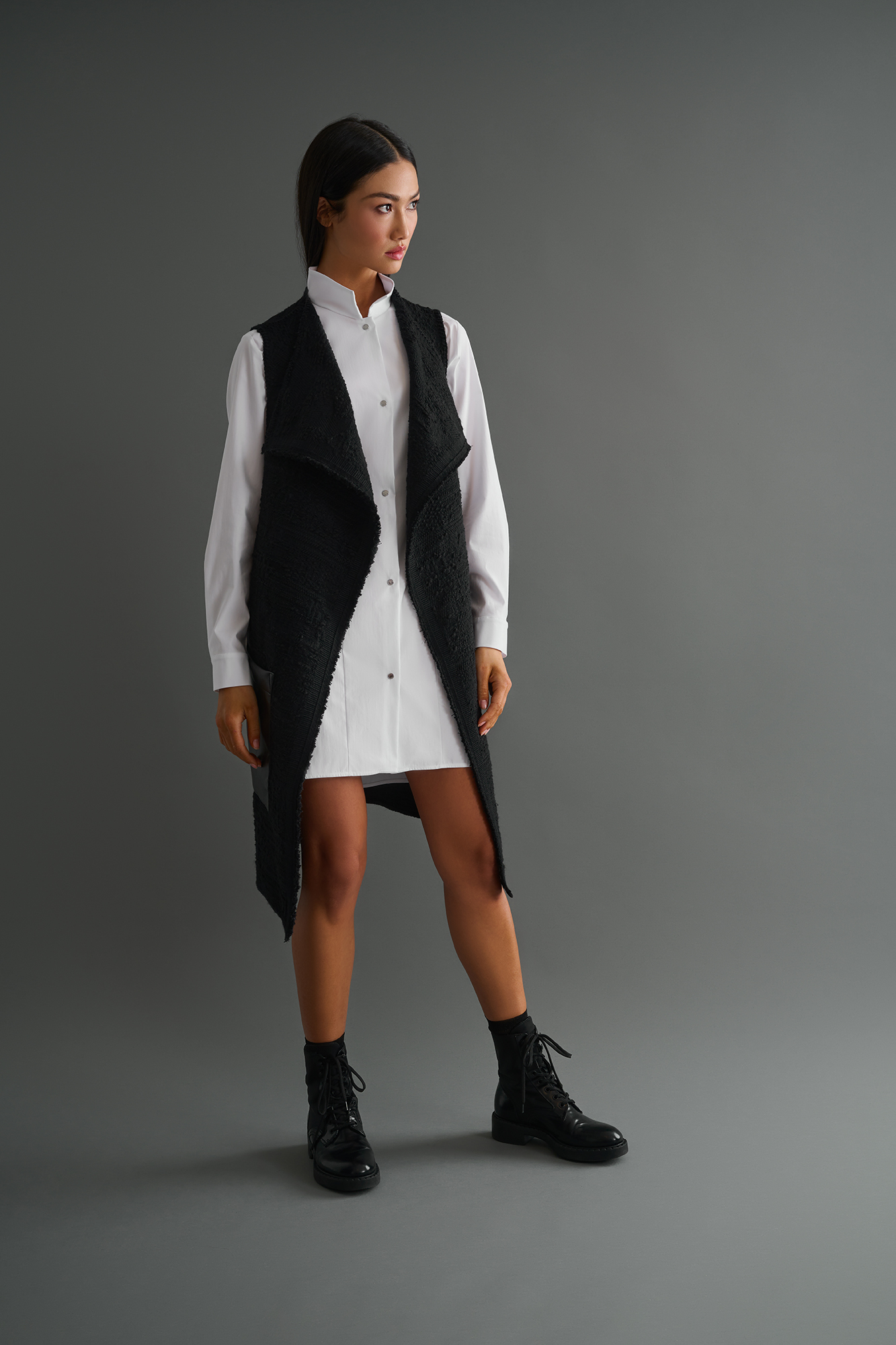 Unique sleeveless long vest, easy to layer with your tops. A versatile piece that elevates your wardrobe with elegance and comfort.