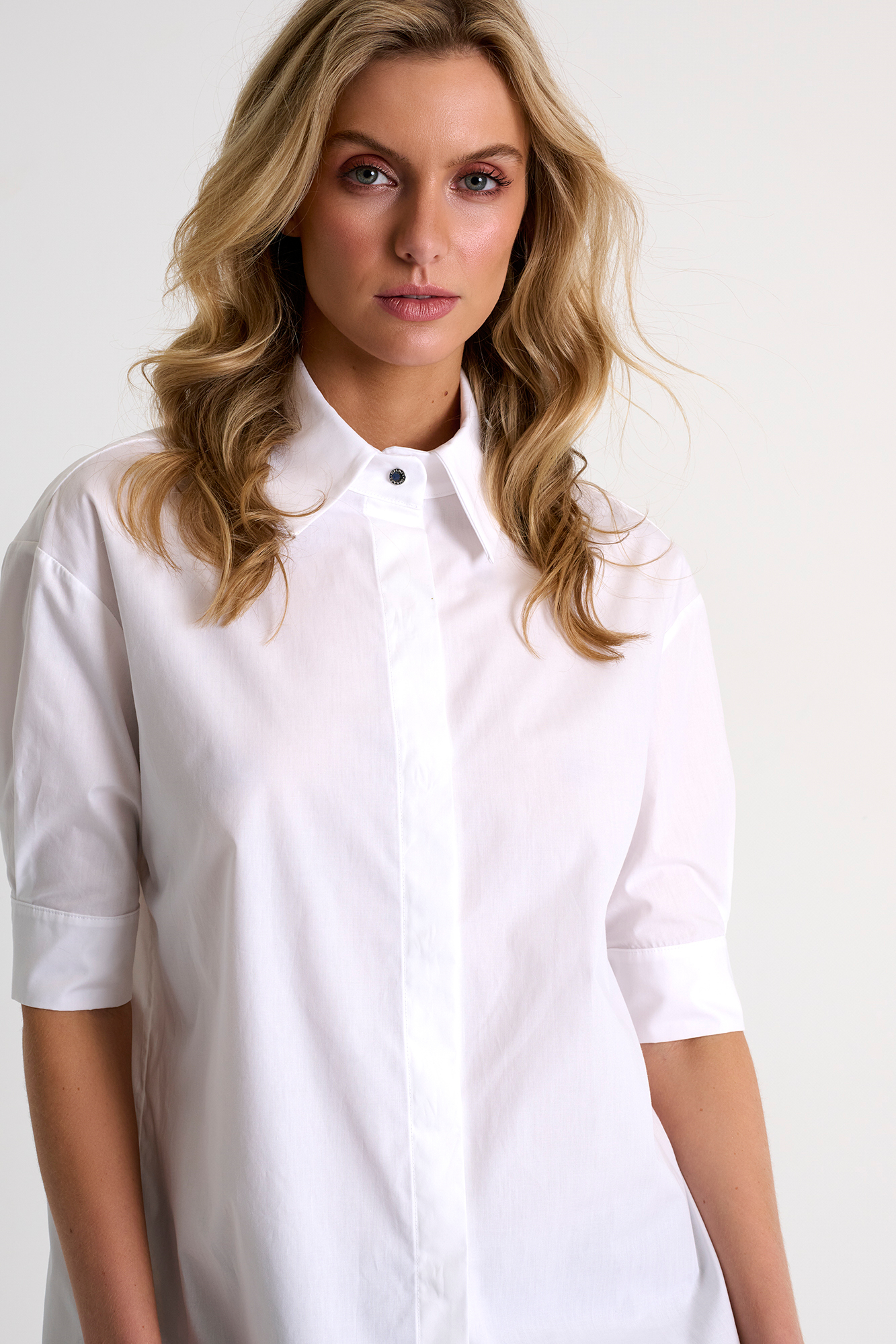 Short-sleeved cotton poplin shirt, combining coolness and lightness. Its straight fit and minimalist design make it an essential and versatile piece for any wardrobe.