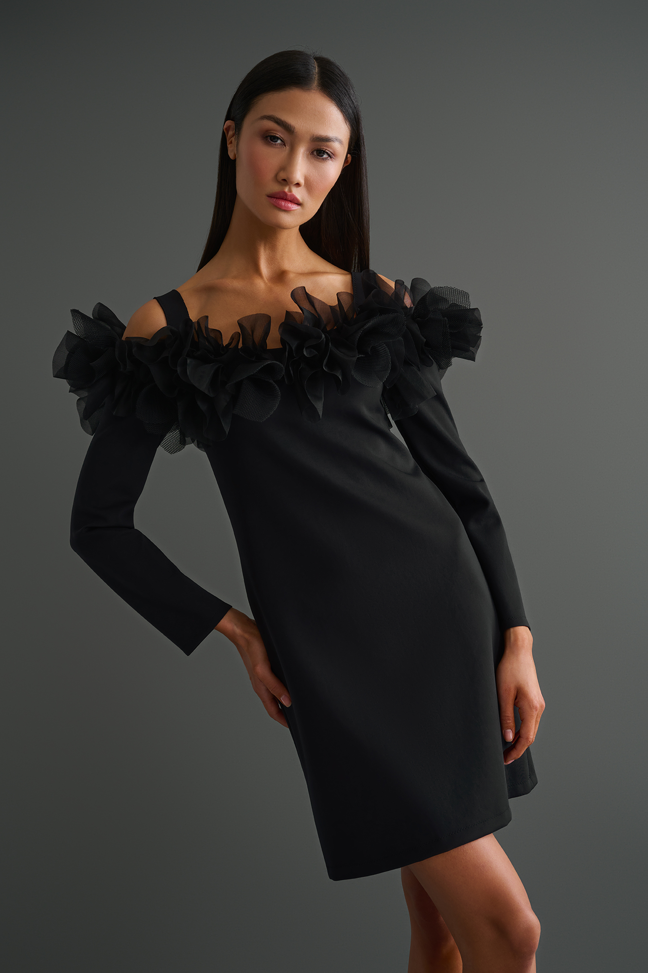 This off shoulder unique and one of a kind dress features short sleeves and thin straps for added comfort. It is adorned with intricate handmade petals that add a touch of glamour.