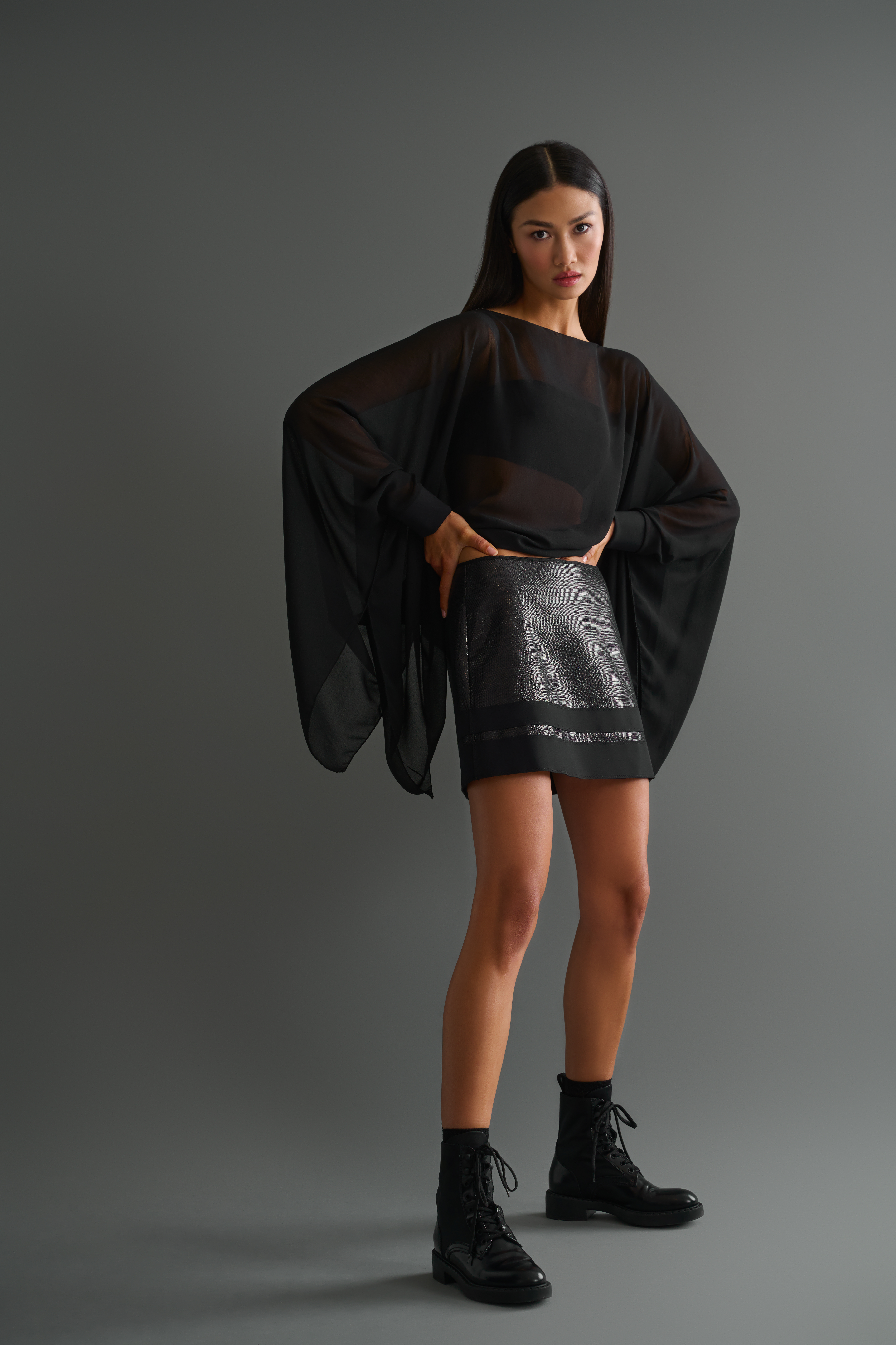 Dazzle at your evening events with this short sparkling skirt, featuring a refined interplay between shiny and matte fabrics, perfect for all your outings.