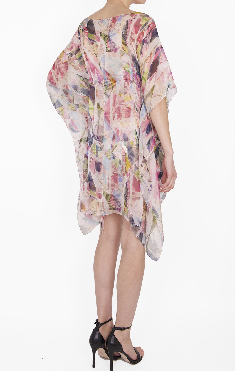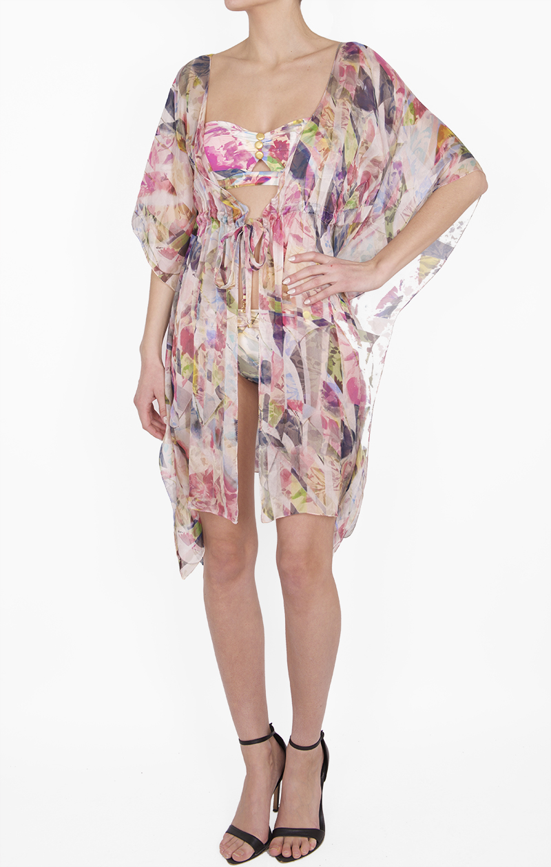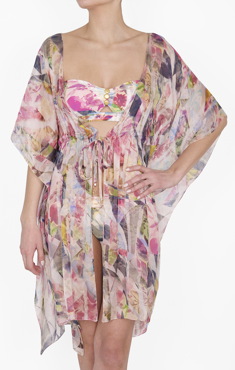 This beautiful kaftan in silk mousseline can easily be worn over a bathing suit or even over a camisole with pants or leggings. It is the perfect piece to wear at the beach in the city or even at home. Its delicate fabric adds a feminine touch to every outfit. Designed and made in Canada with exclusive Italian fabrics.