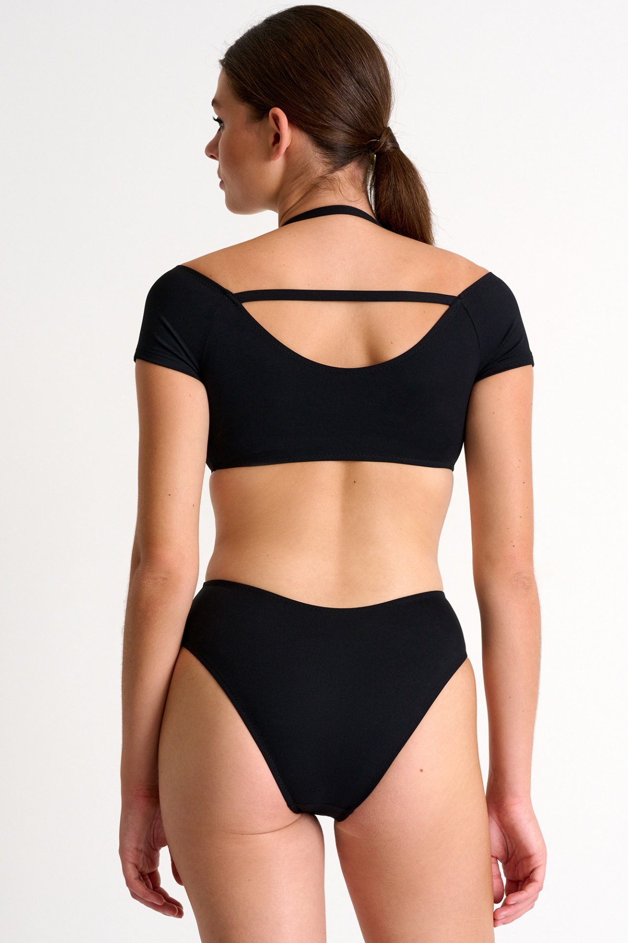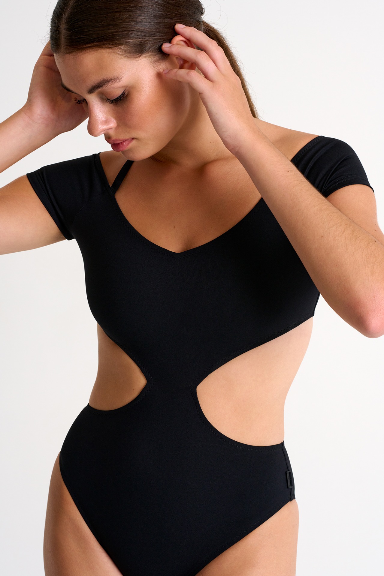 This side cut out one-piece is giving your look that beautiful hourglass shape. Its off-the-shoulder neckline is secured with thin straps to assure comfort and confidence.