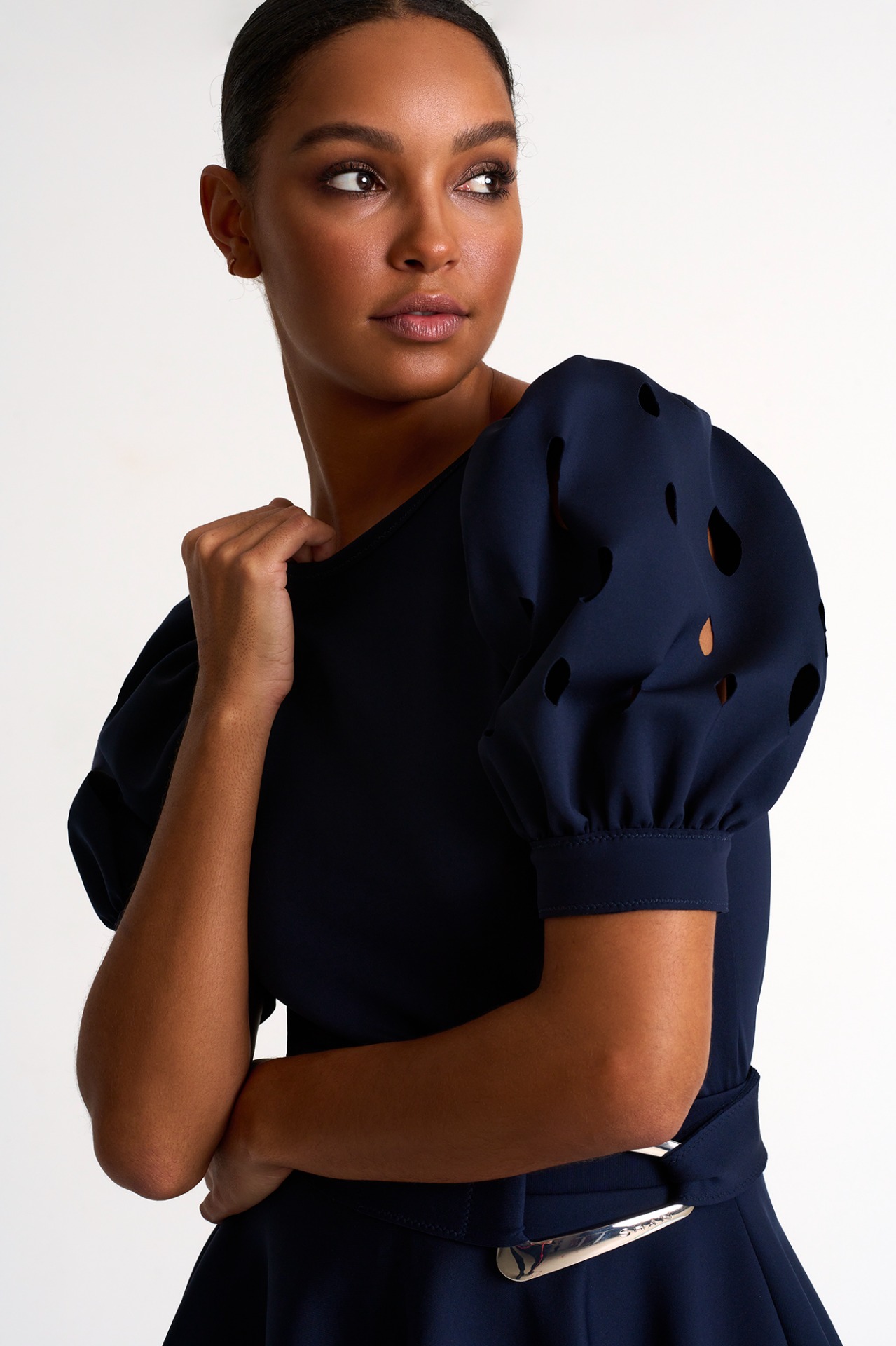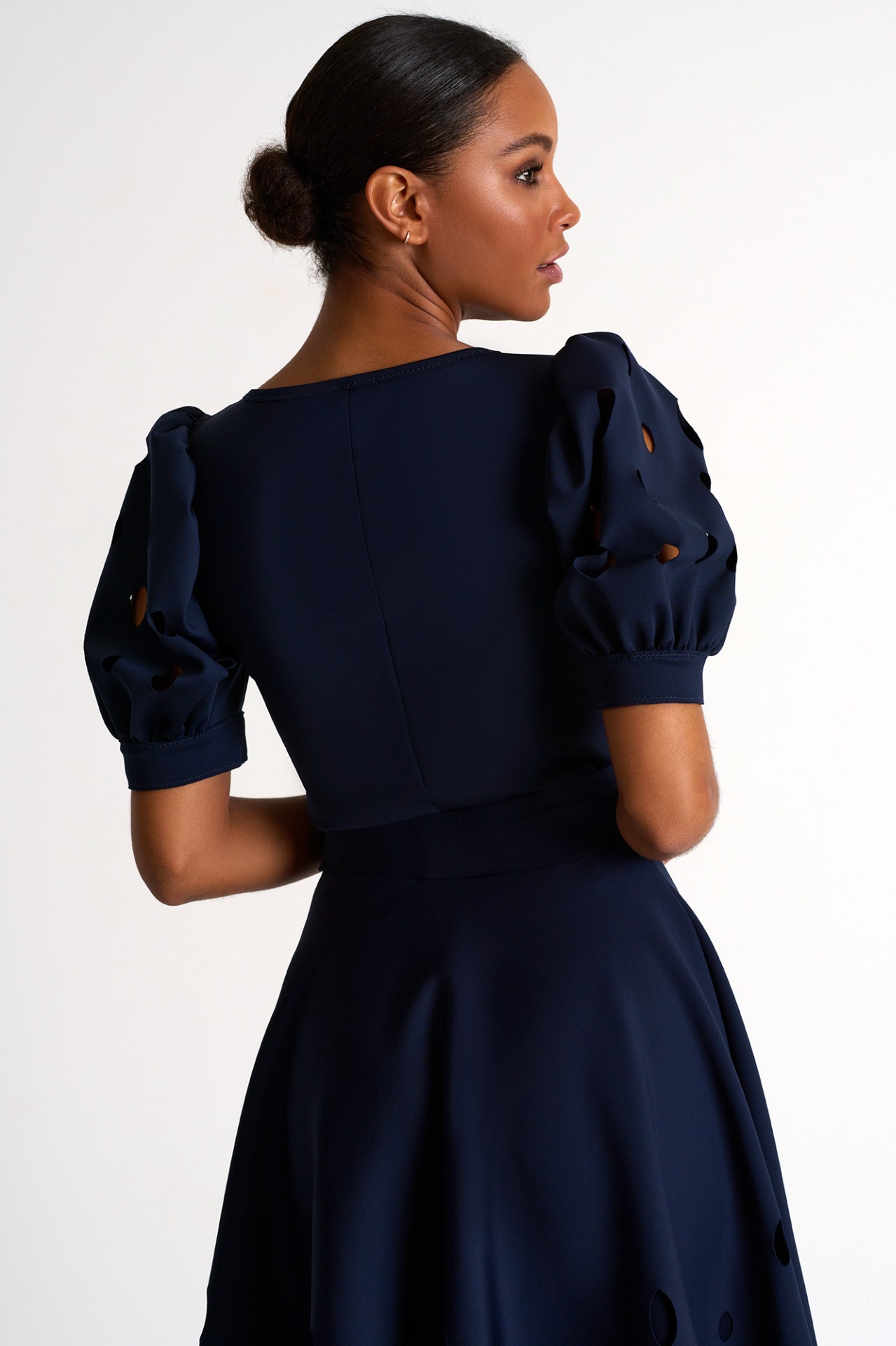 Elegant balloon-sleeve top, enhanced by oval cutouts creating an enchanting sheer effect.