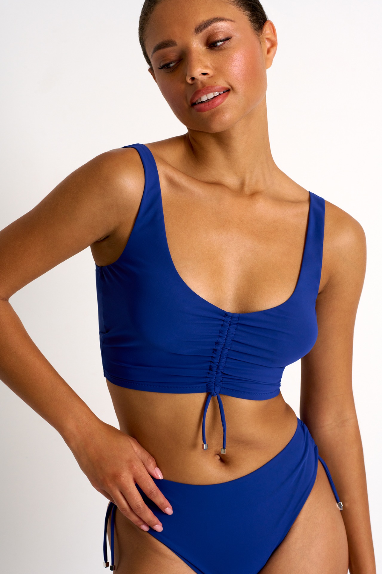 Feminity take on the classic bralette bikini top accented with ruched front detail, adjustable strings and a V-neckline.