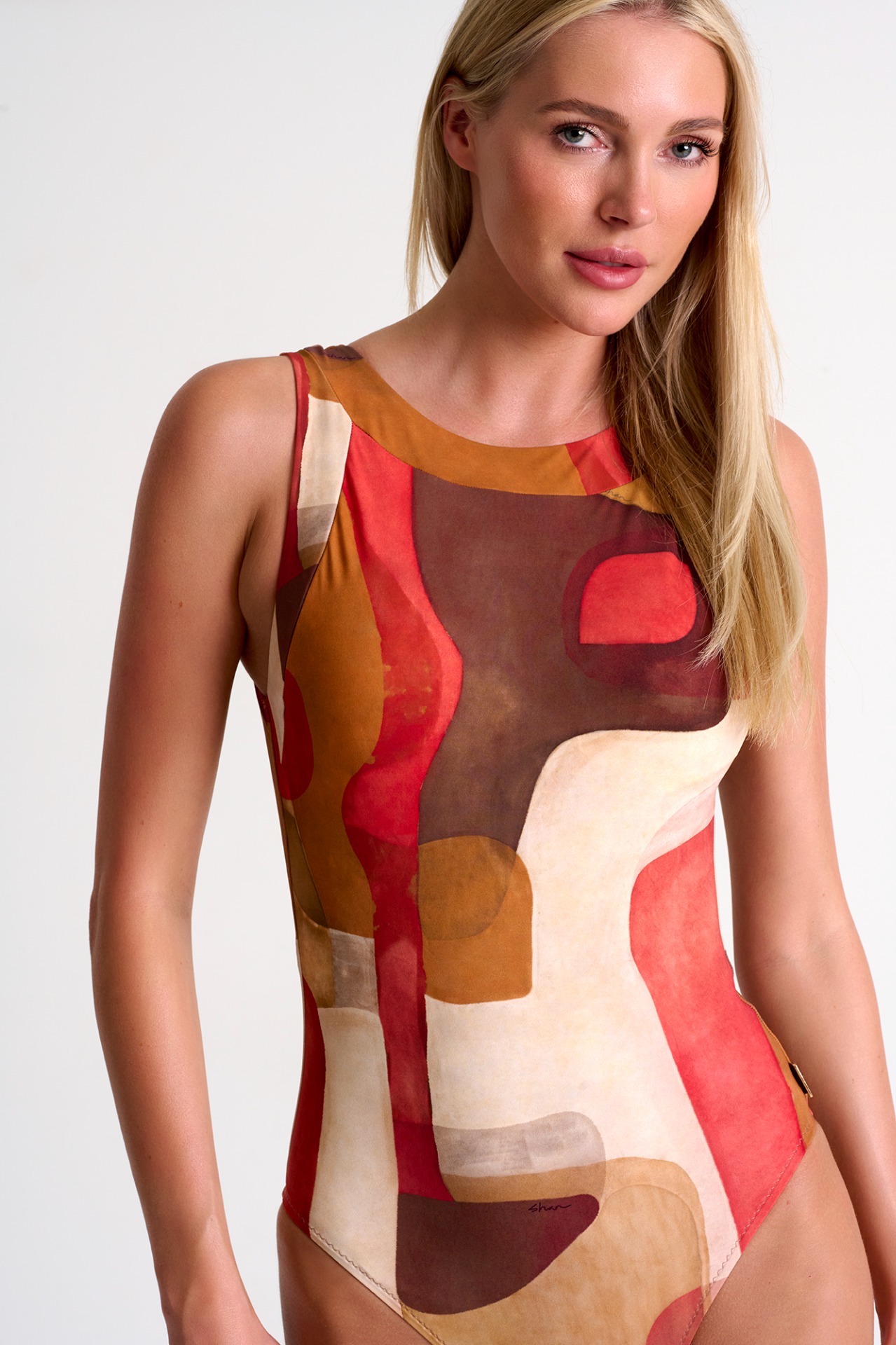 Classic high-neck one-piece swimsuit with an open back, offering generous coverage for optimal comfort and adaptability to every movement.