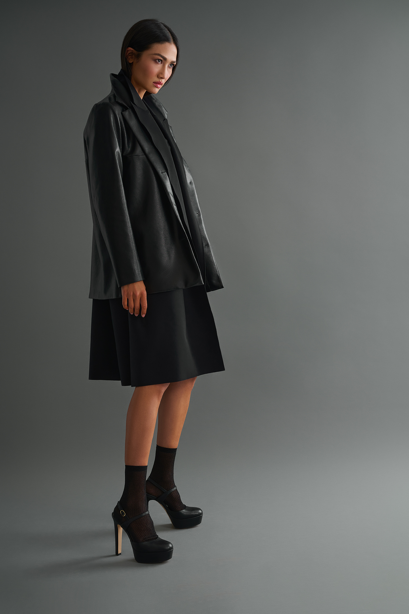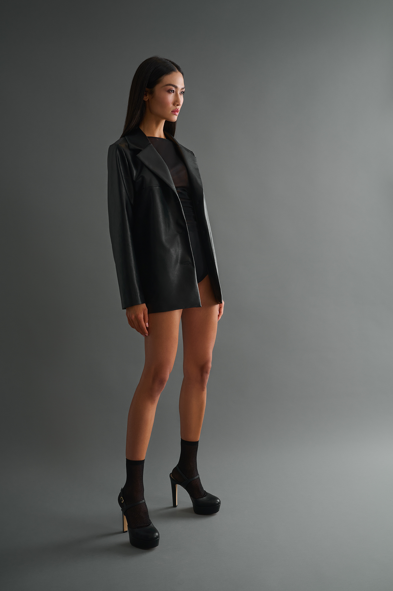 This oversize structured vegan leather blazer adds character and confidence to any outfit.