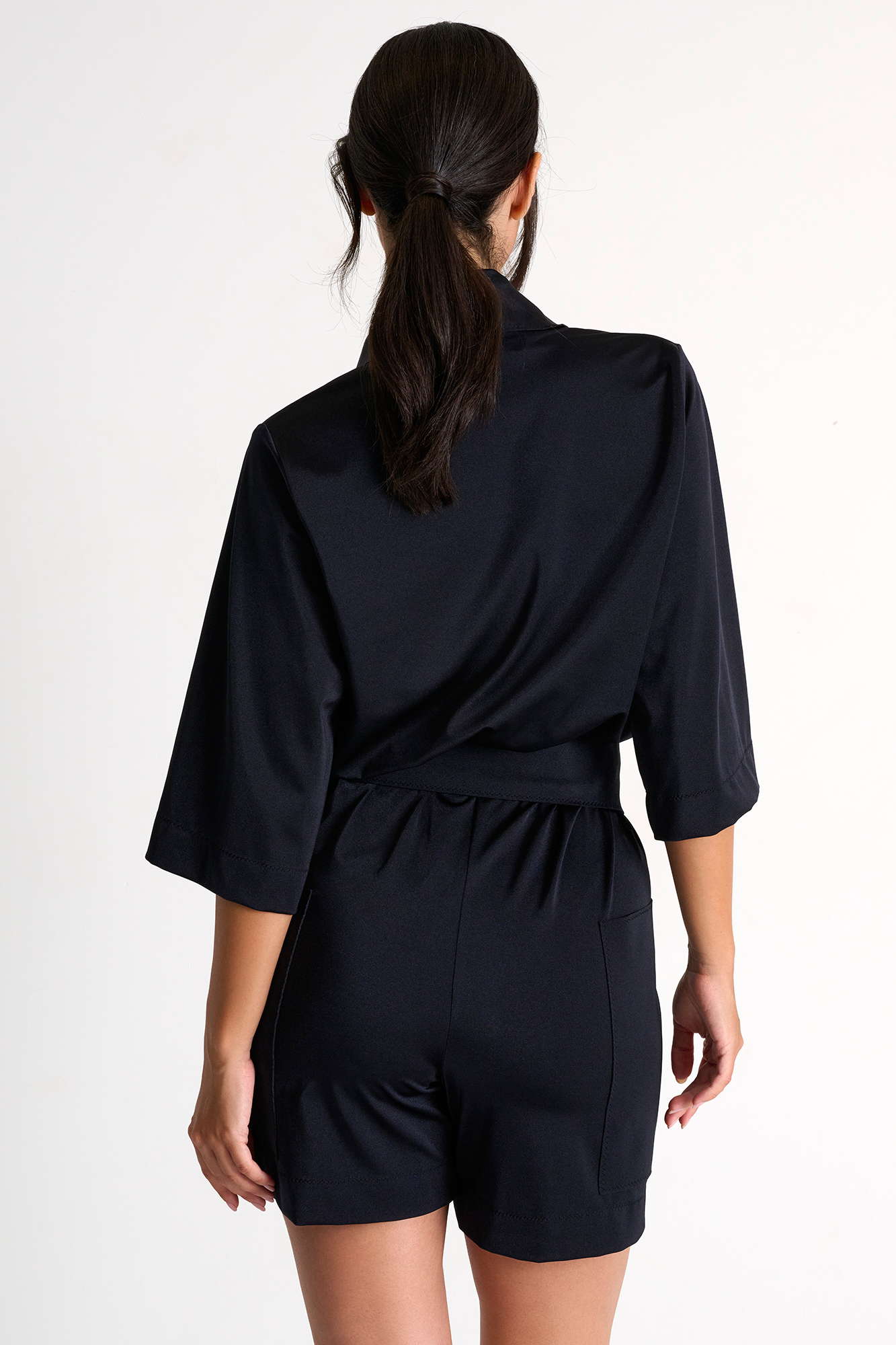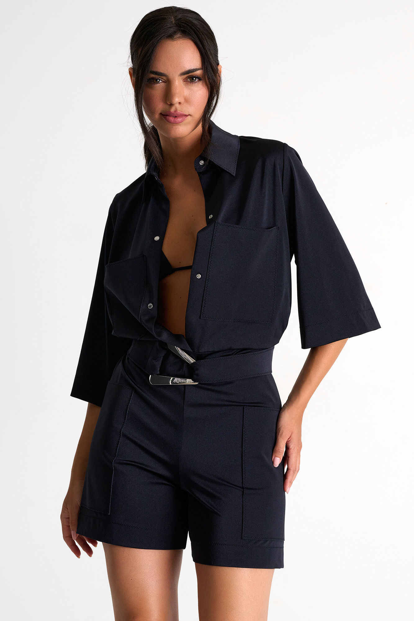Chrome effect short jumpsuit featuring an elegant shirt collar, short sleeves, and large stitched pockets at the bust and thighs. An integrated silver belt adds a touch of sophistication. Its luxurious and shiny appearance promises rare elegance.