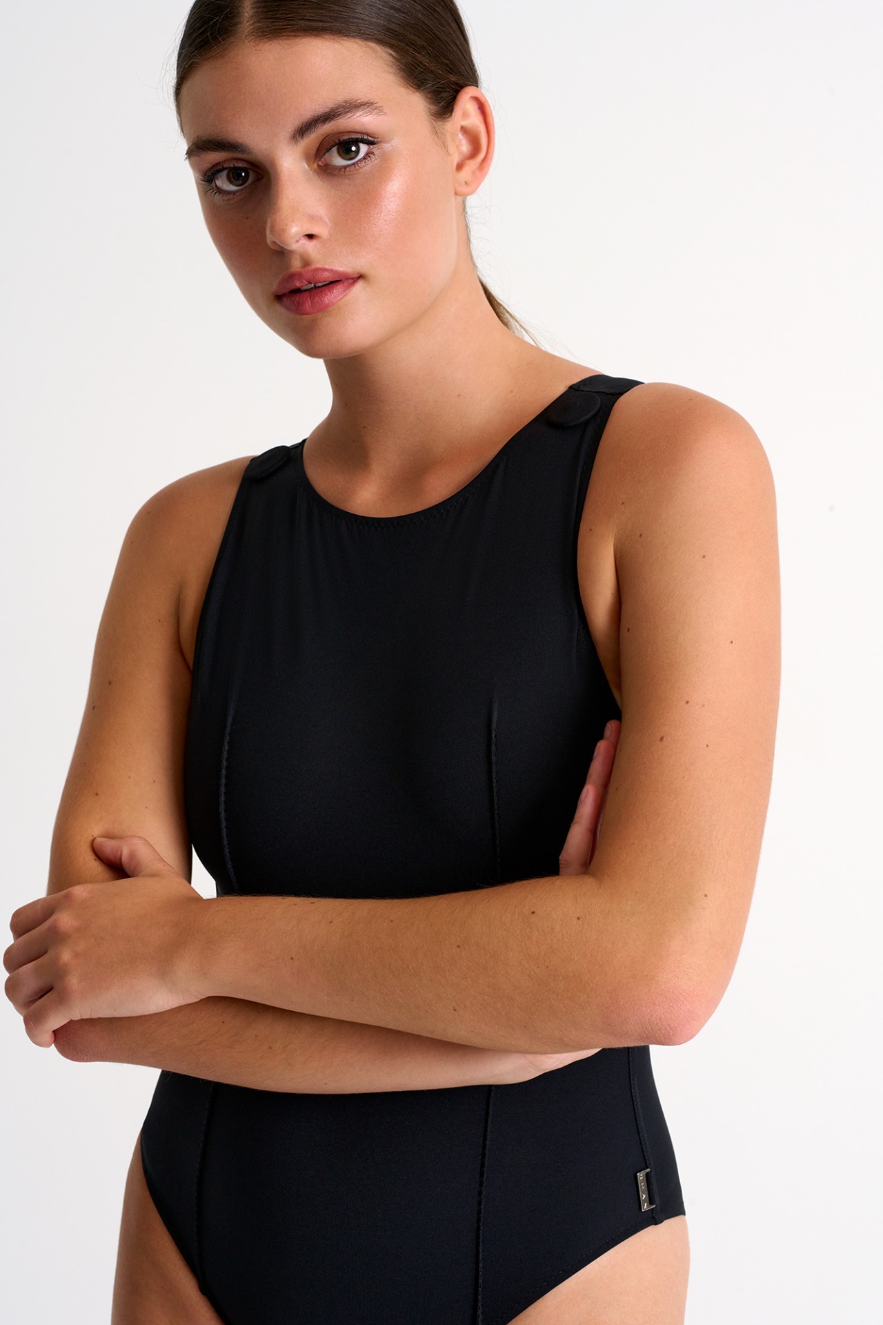 High-neck one-piece with retro shoulder button and exstensible fabric. This piece is comfortable and flatter all types of silhouette.
