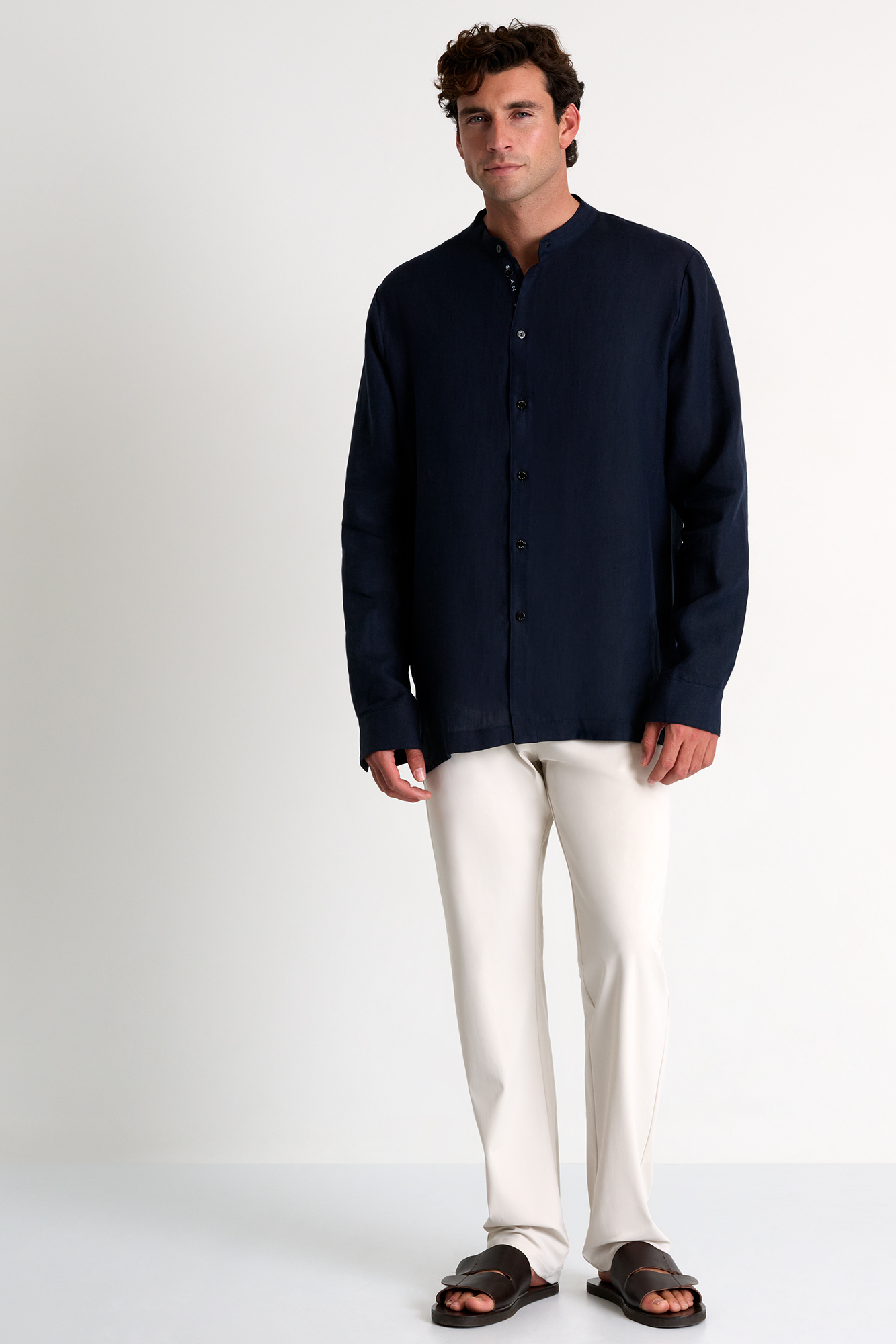 This long-sleeve linen shirt accentuated by a mandarin collar is elegant and easy to style with any pants or shorts.