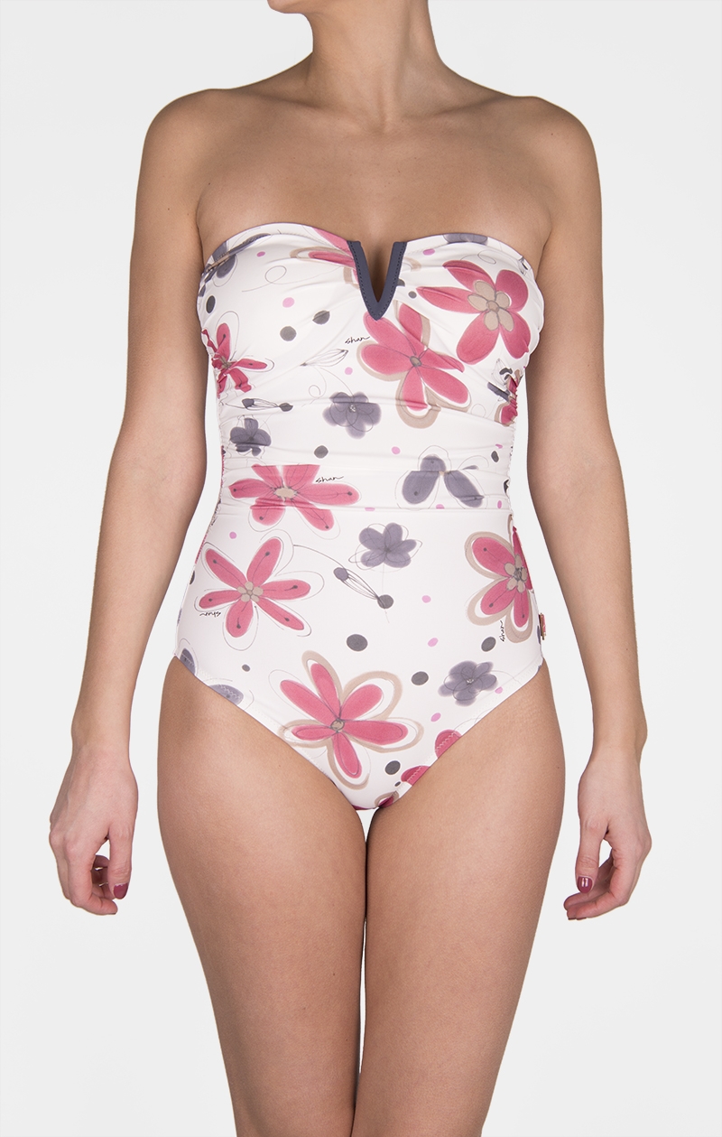 This bandeau style bathing suit offers good support with its shelf bra and its light padding. It can be worn multiple ways thanks to its adjustable and removable straps and silicon band. The plunging horseshoe-shaped neckline elegantly enhances lovely feminine curves while adding a feminine touch . This bathing suit is a must-have in any resort wear wardrobe. Made in Canada with exclusive Italian material.