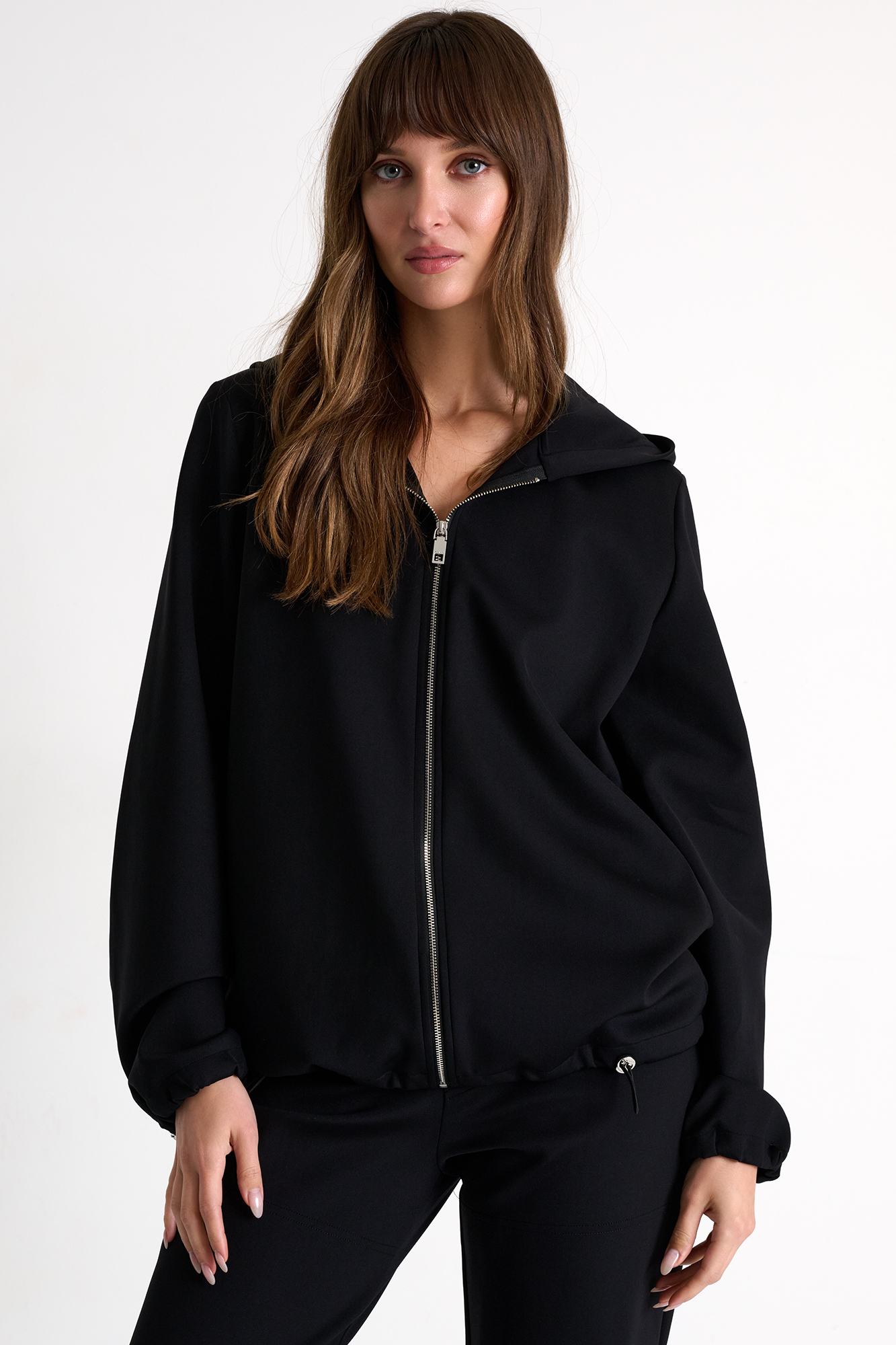 This hooded jacket with long sleeves, designed to fit the waist and wrists, perfectly combines an elegant and casual silhouette for an absolutely comfortable feel.