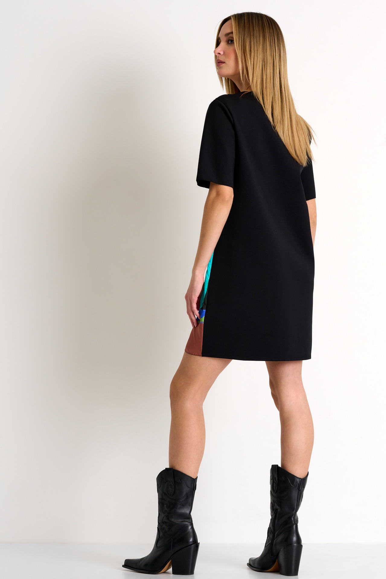 Classic and contemporary short sleeve dress combining the comfort of the 3D Jersey fabric and the elegance of the delicate silk for an effortless chic look.