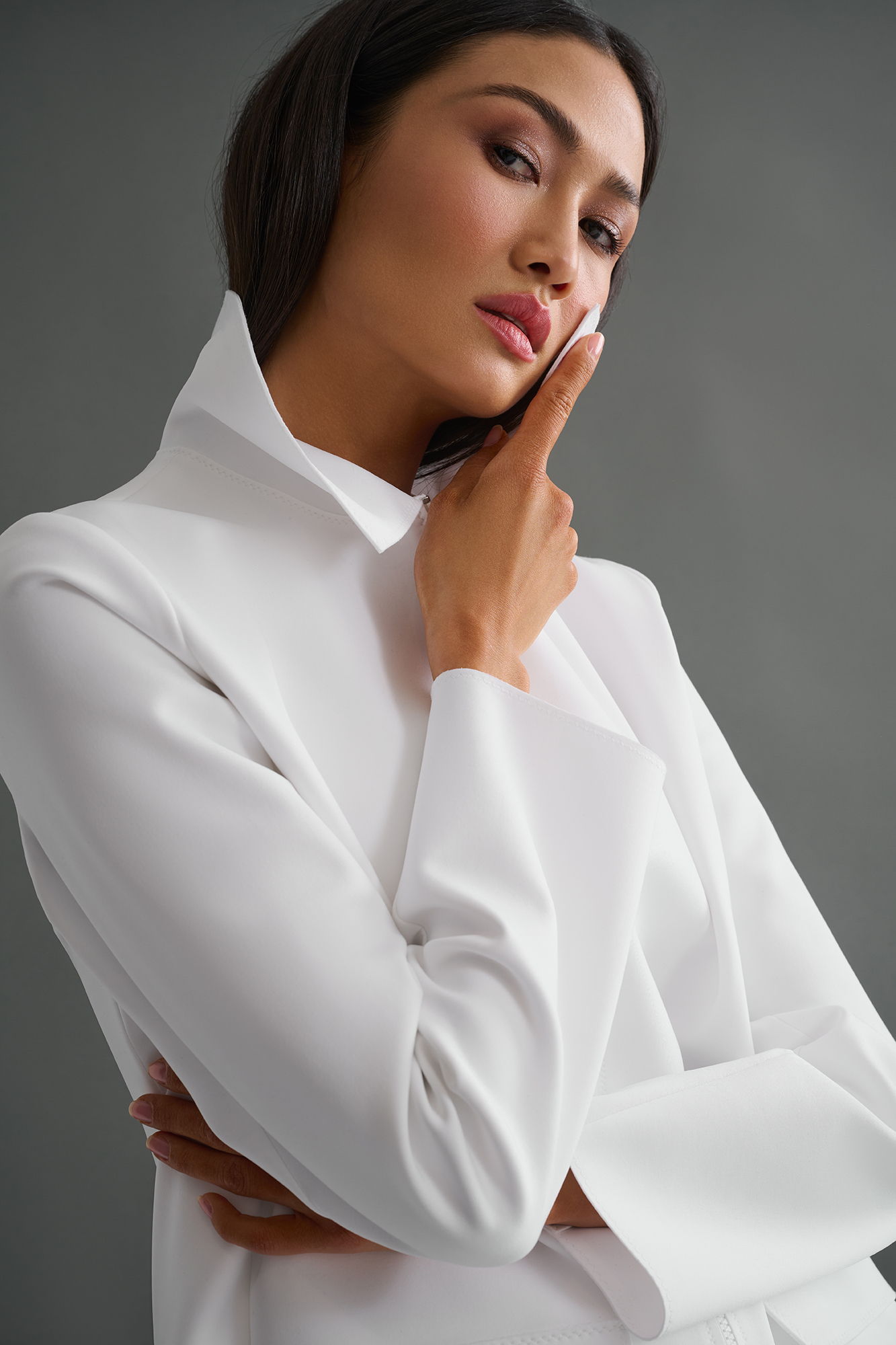 Jersey cropped blazer with notched lapels and straight lines, for a contemporary silhouette and sleek style.