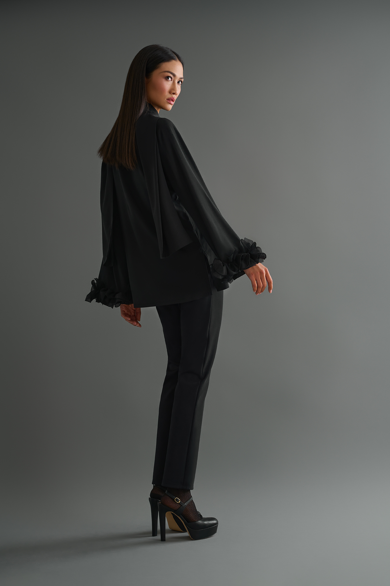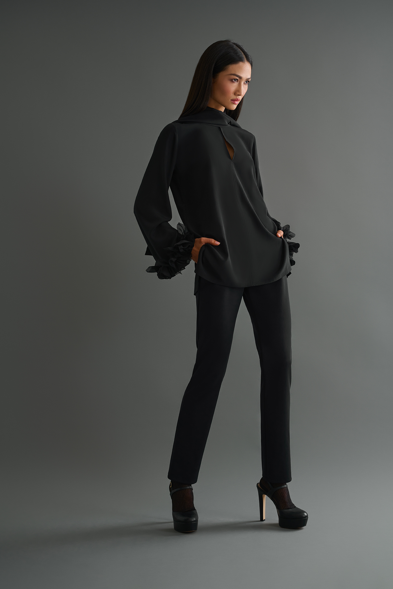 Long-sleeved blouse with a necktie bow, embodying the essence of glamour with its unique and frivolous petal details.