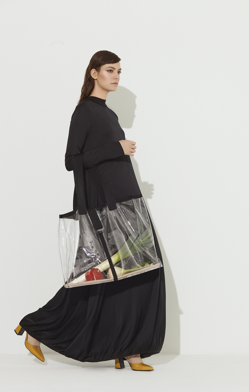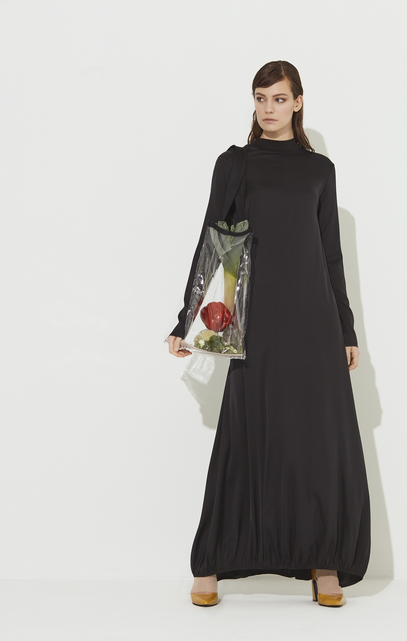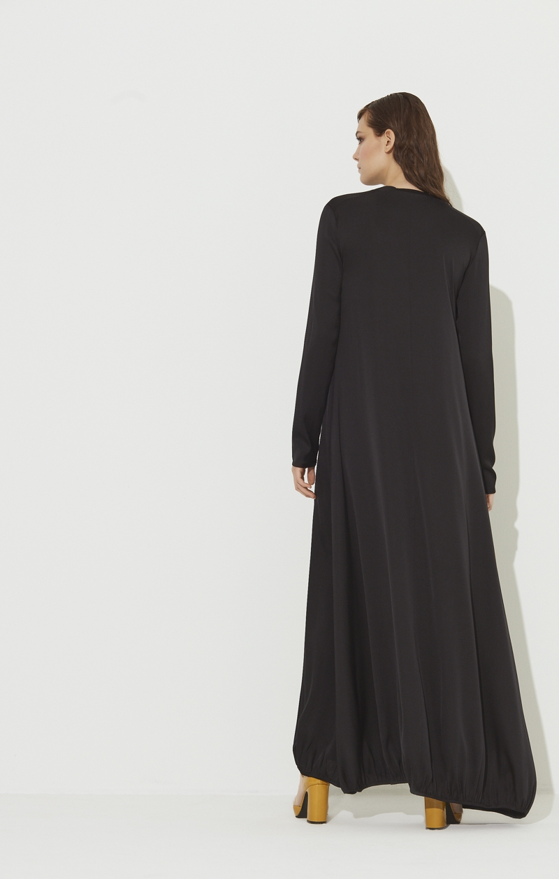 Robe longue et maxi au style A-Line coupée en satinette de soie. L'encolure ronde et près du cou est maintenue par un rib de fin jersey. Les manches sont longues et ajustées.