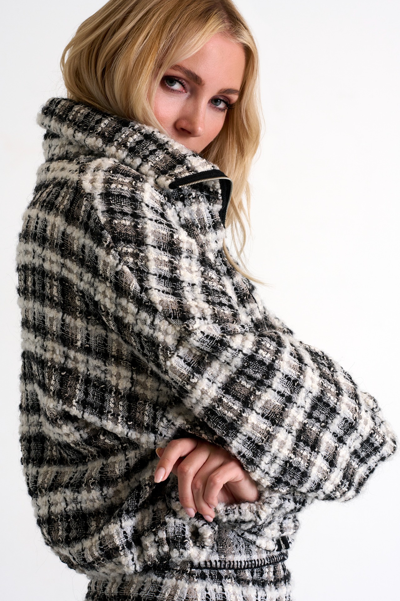 Cette veste bomber, dotée d'un col à revers raffiné, arbore une texture intemporelle et dispose d'un ajustement élastique à la taille, votre indispensable pour toutes les saisons.