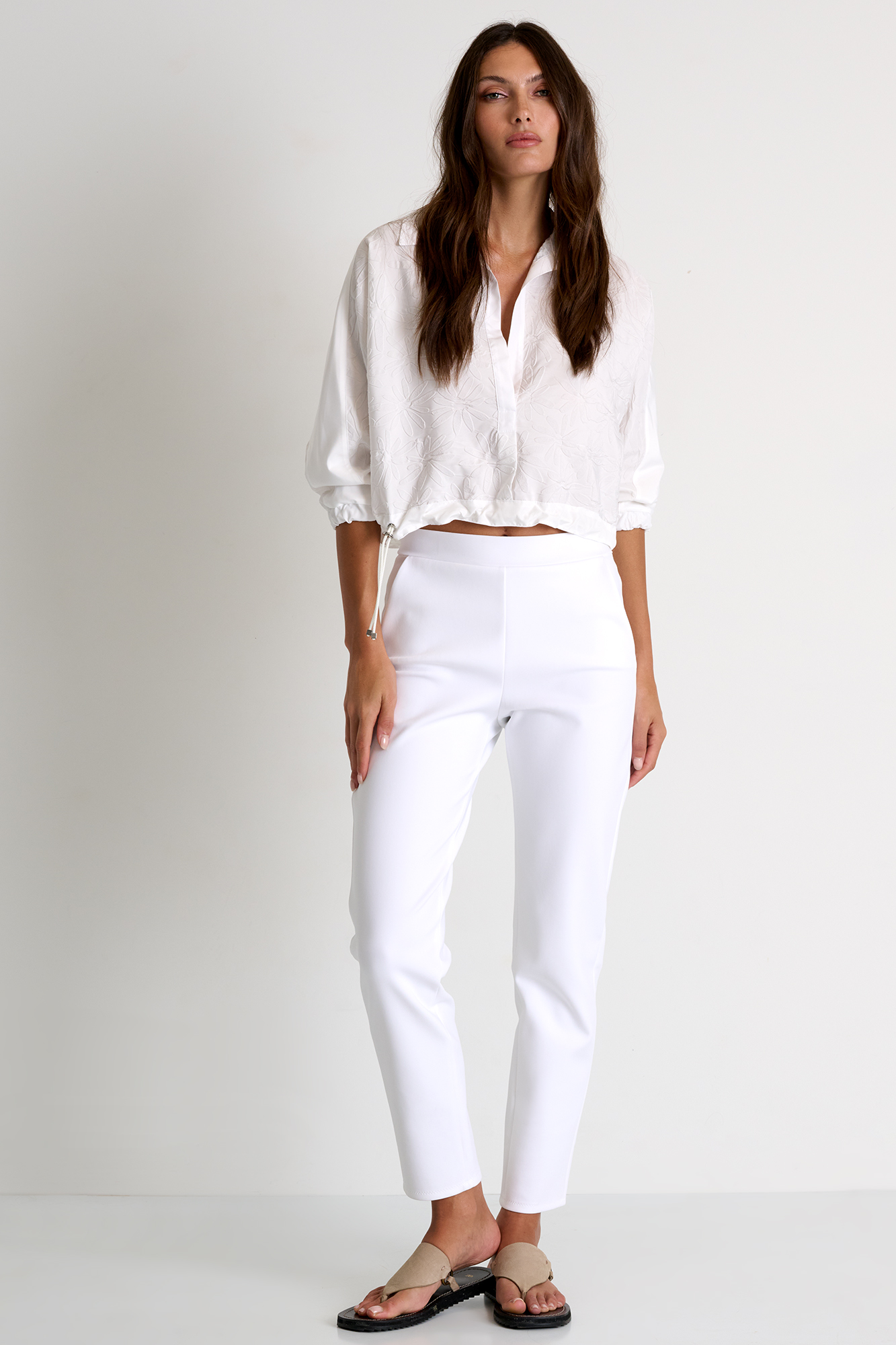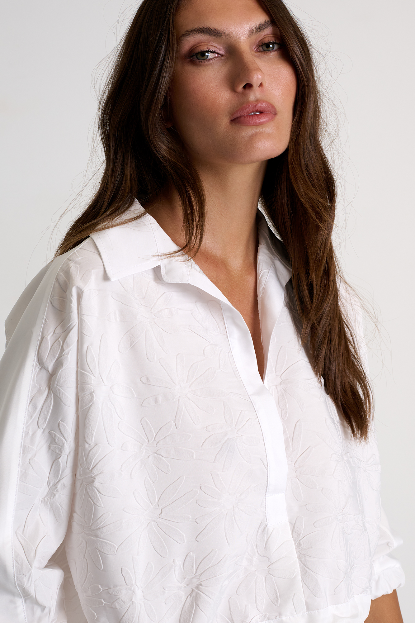 Chemisier écourté en toile fleurie effet nylon avec des finitions en lycra, doté d'un décolleté flatteur et de manches 3/4. La taille est ajustable grâce à une boucle, pour un look sur-mesure.