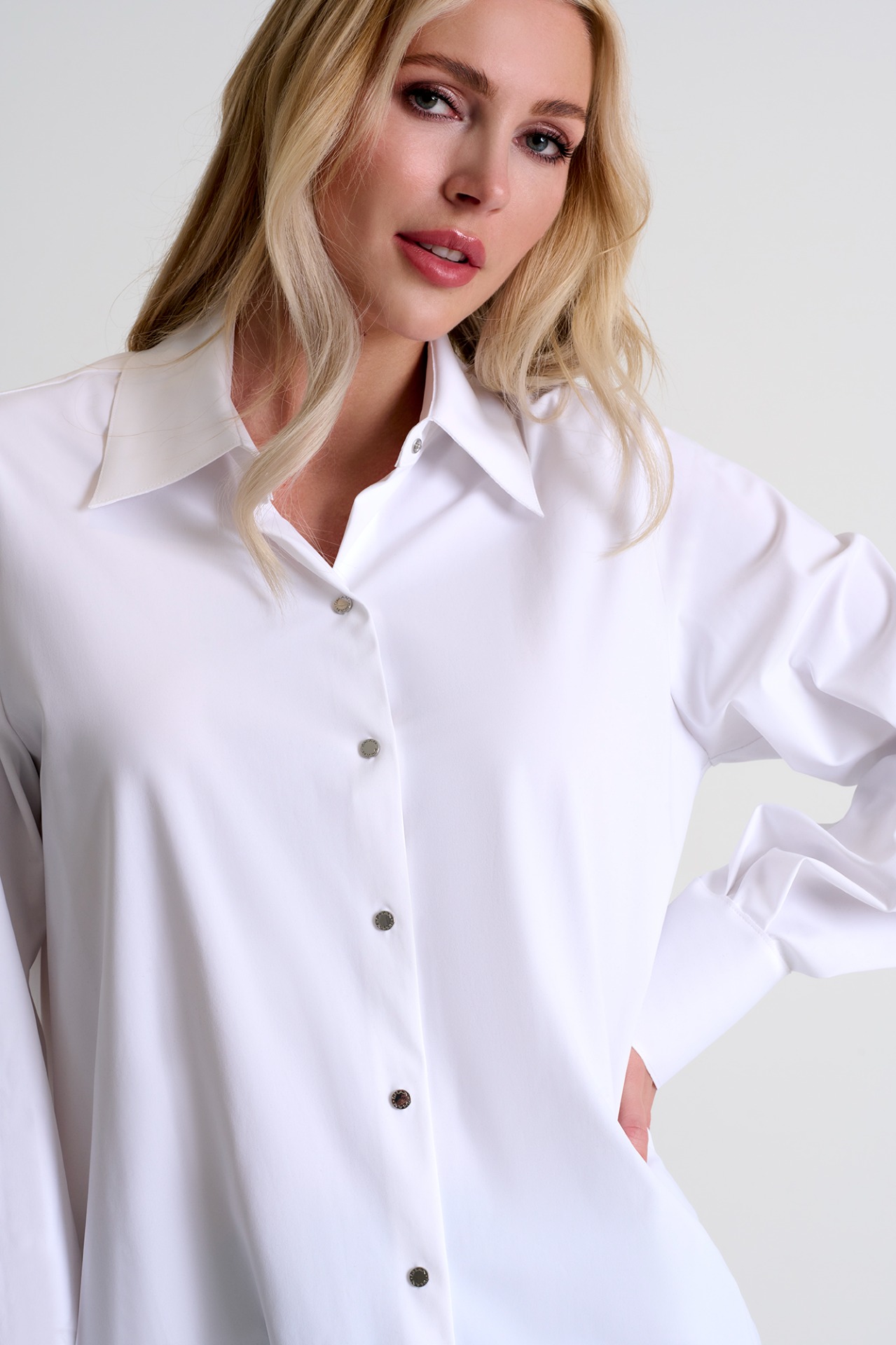 Cette chemise en jersey lycra se distingue par ses manches plissées au poignet, offrant un effet subtilement bouffant, pour une véritable expression contemporaine de féminité.
