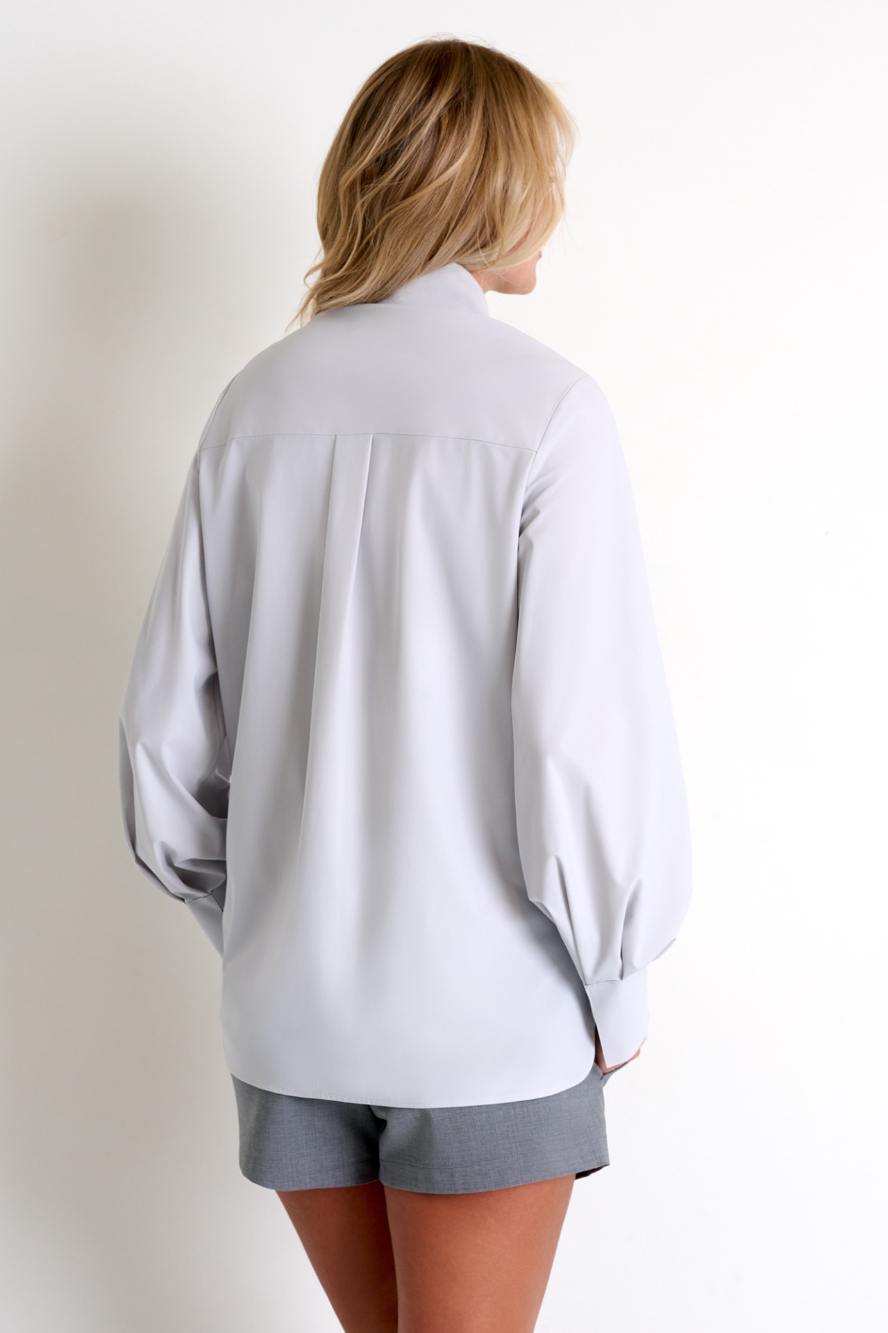 Cette chemise en jersey lycra se distingue par ses manches plissées au poignet, offrant un effet subtilement bouffant, pour une véritable expression contemporaine de féminité.