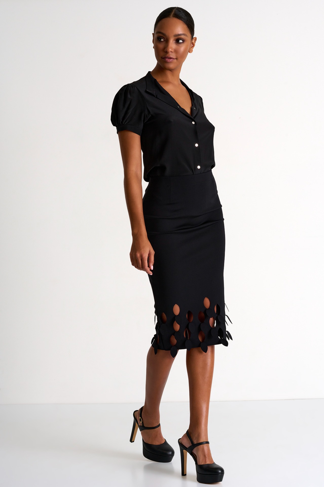 Jupe fuseau élégante avec découpes en forme de pétales suspendues au bas, cintrée pour affiner la silhouette.