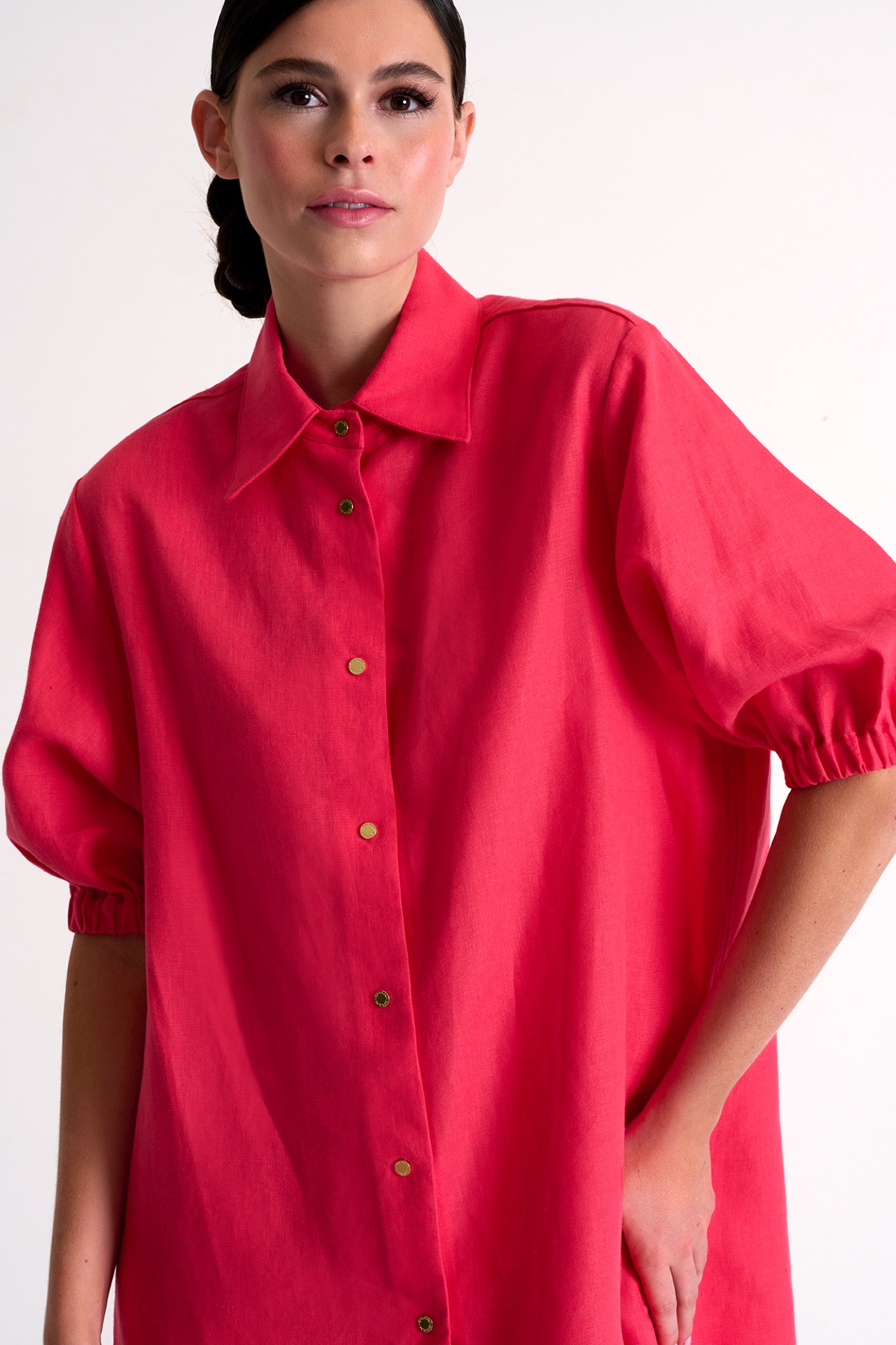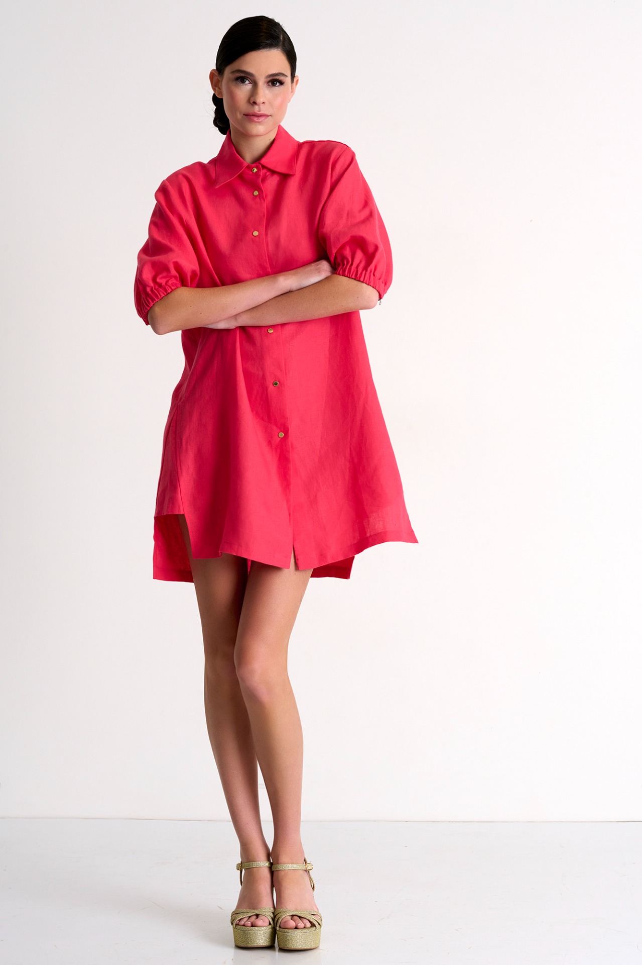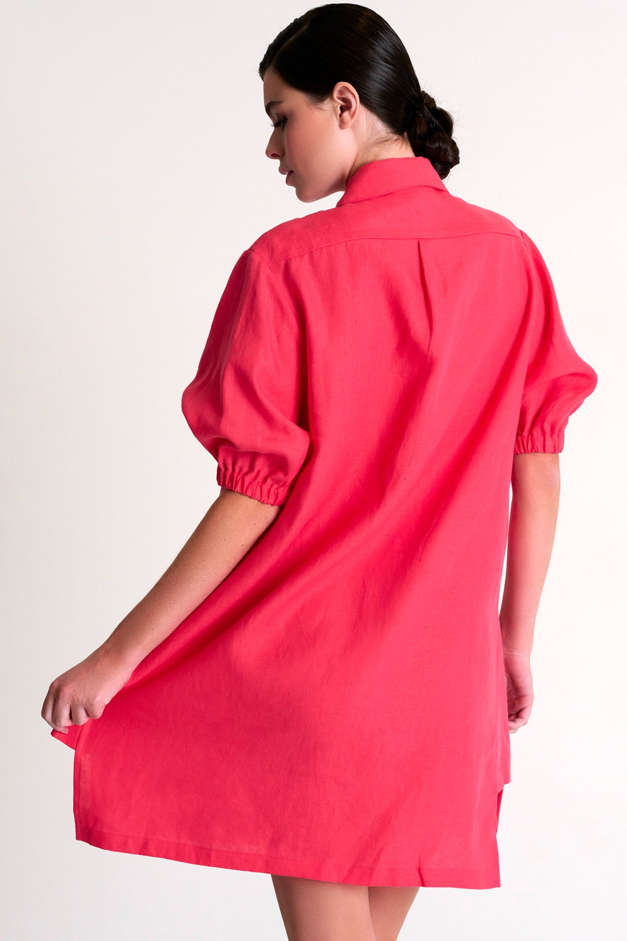 Fabriquée avec du lin, cette robe charmante est dotée de manches bouffantes courtes et élégantes. Ses détails exquis incarnent la finesse et la grâce.