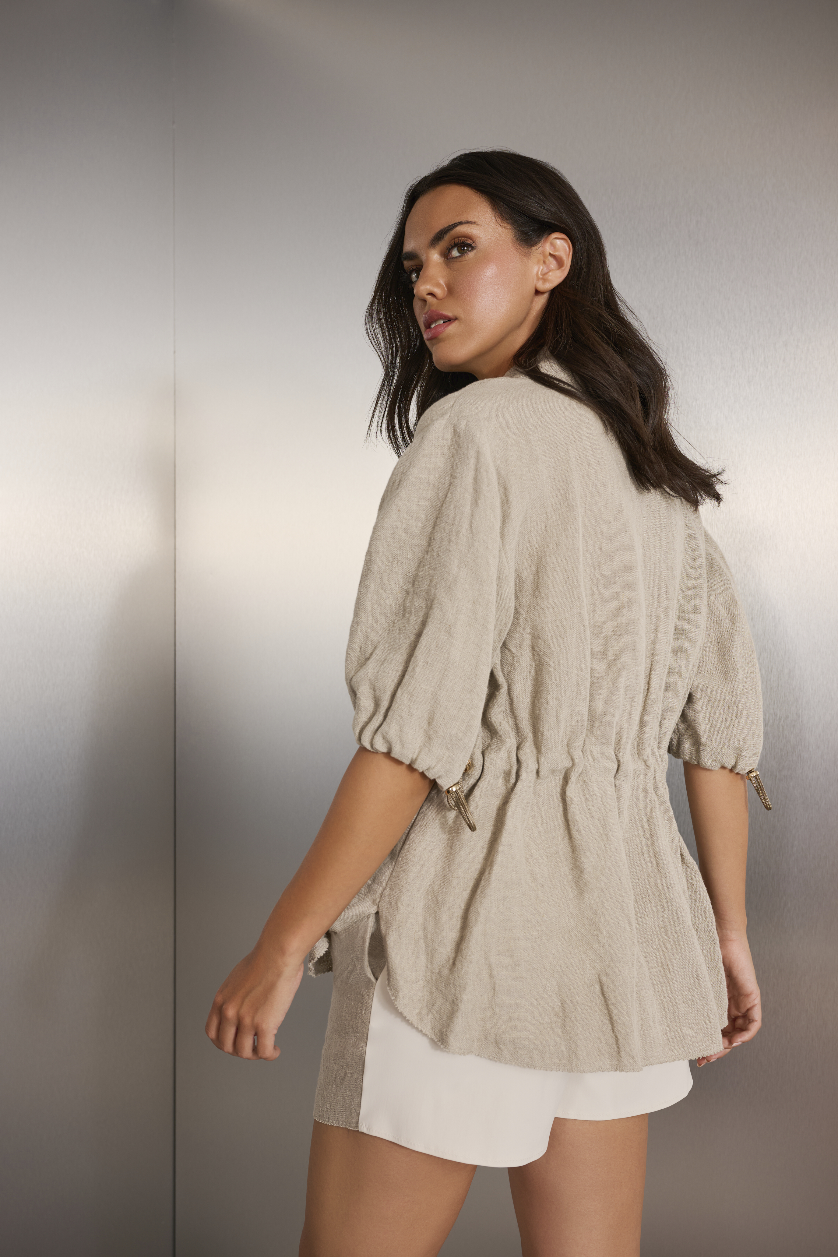 Ce chemisier à manches courtes, boutonné à l'avant, présente des manches bouffantes ajustables et se cintre à la taille pour une silhouette définie. Confectionné dans un lin doux, léger et aéré, il offre un look à la fois riche et naturel.