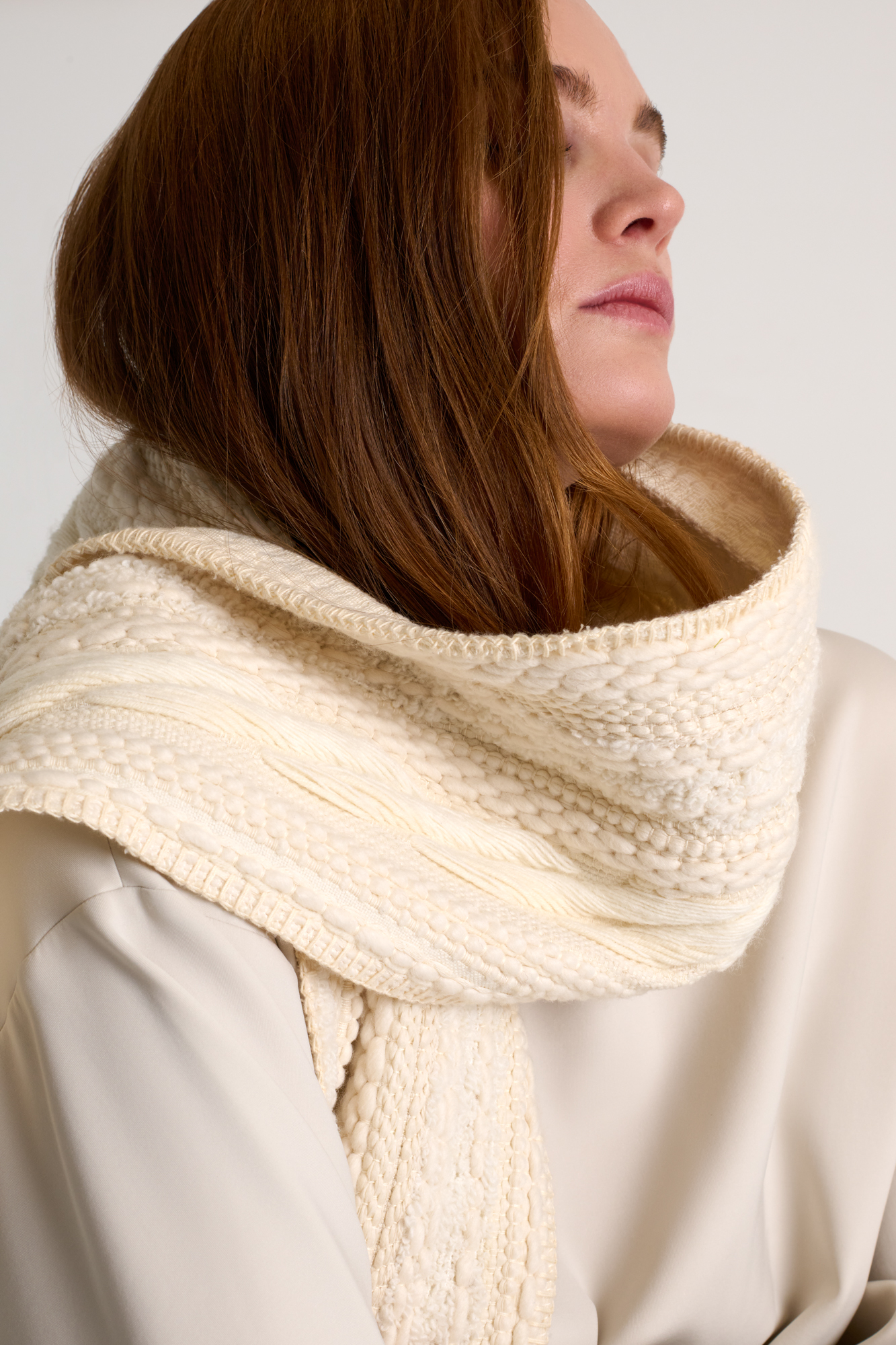Écharpe luxueuse confectionnée en laine douce et texturée, offrant chaleur et élégance naturelle. Un accessoire incontournable pour rehausser vos tenues avec raffinement.