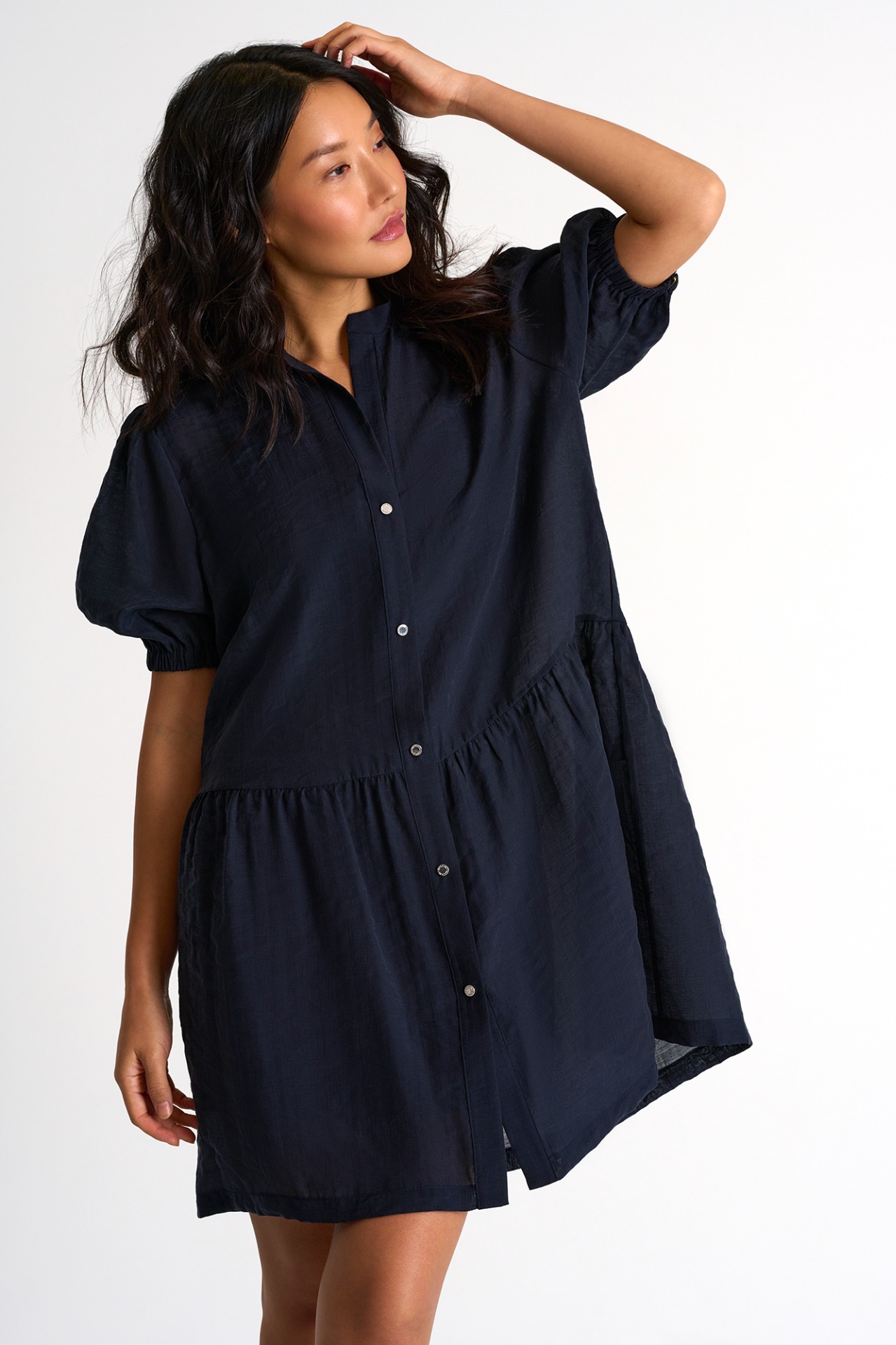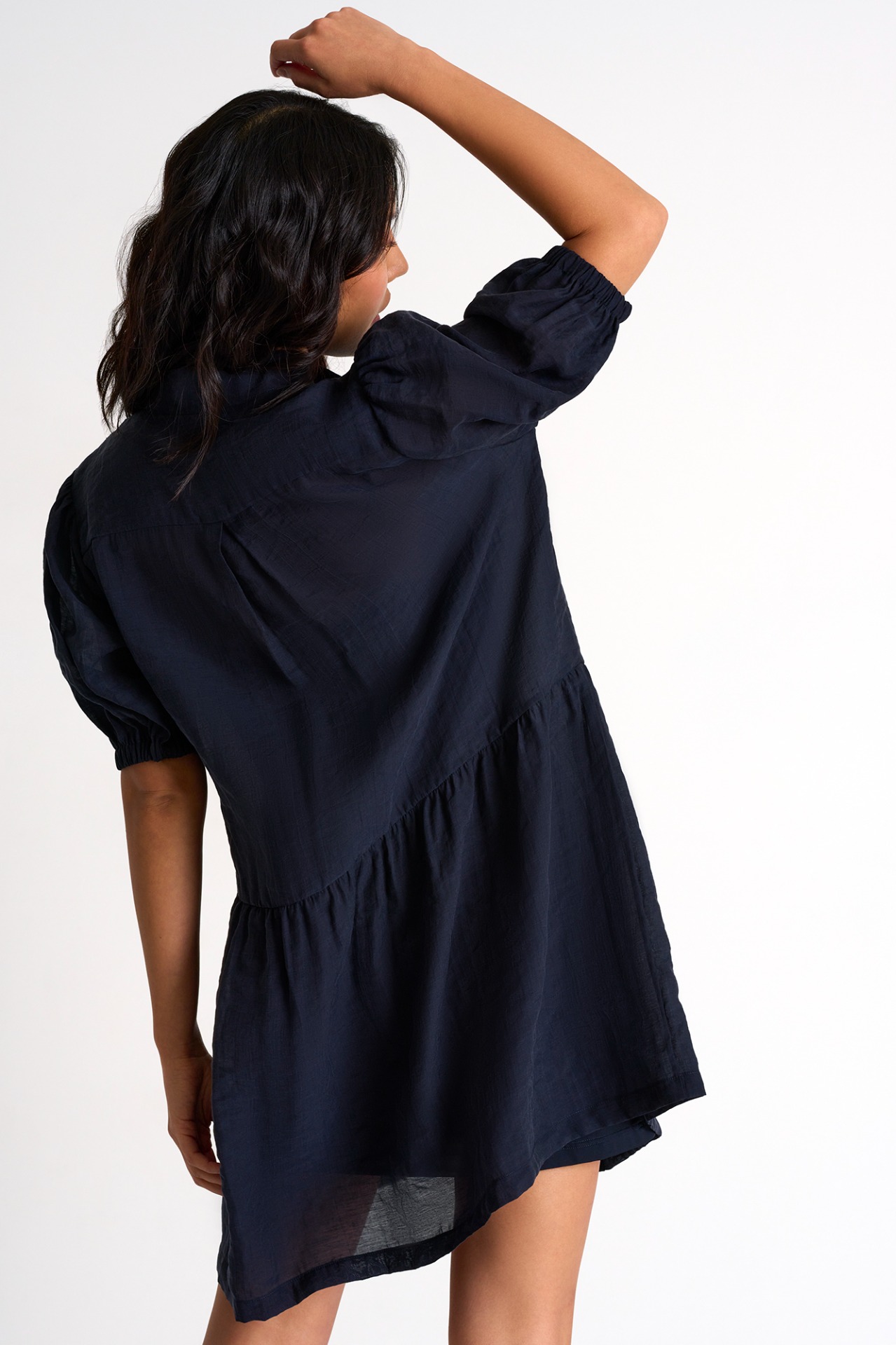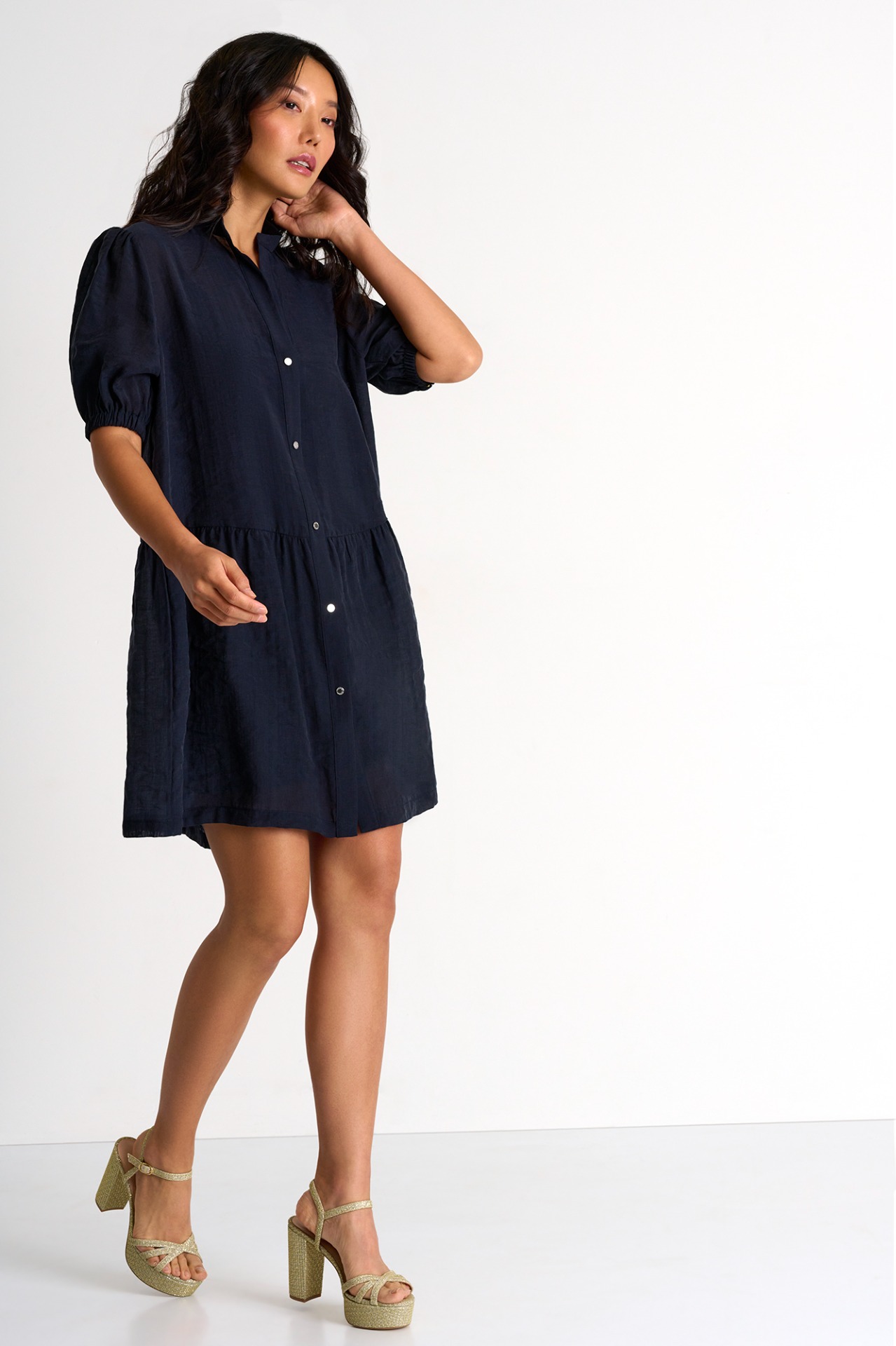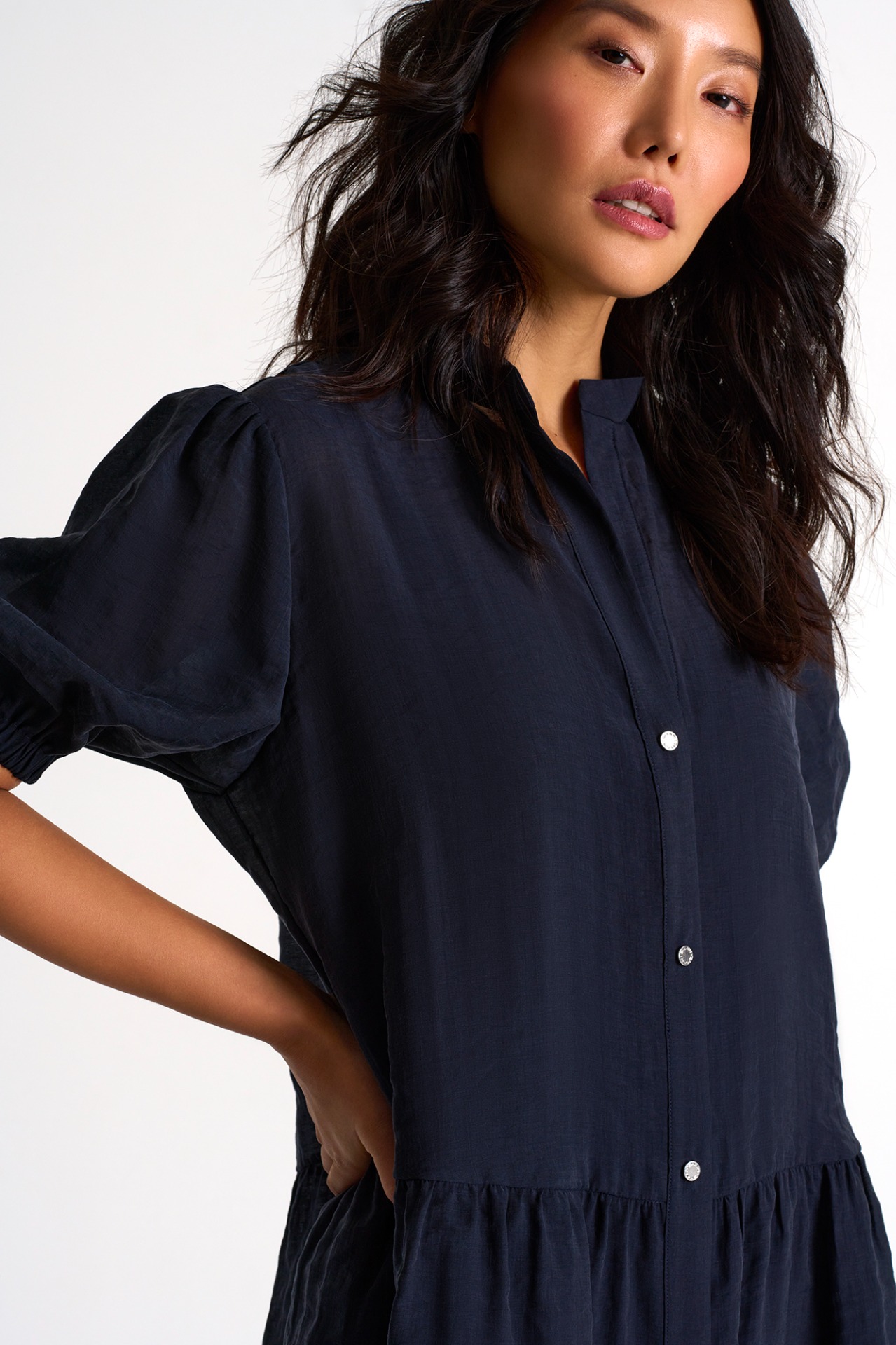 Cette élégante robe à manches bouffantes présente une coupe évasée et une fermeture à boutonner à l'avant. Elle est accompagnée d'un jupon pour plus de confort et de confiance. Fabriquée à partir de fibre naturelle d'eucalyptus écoresponsable, cette robe est très douce et légère.