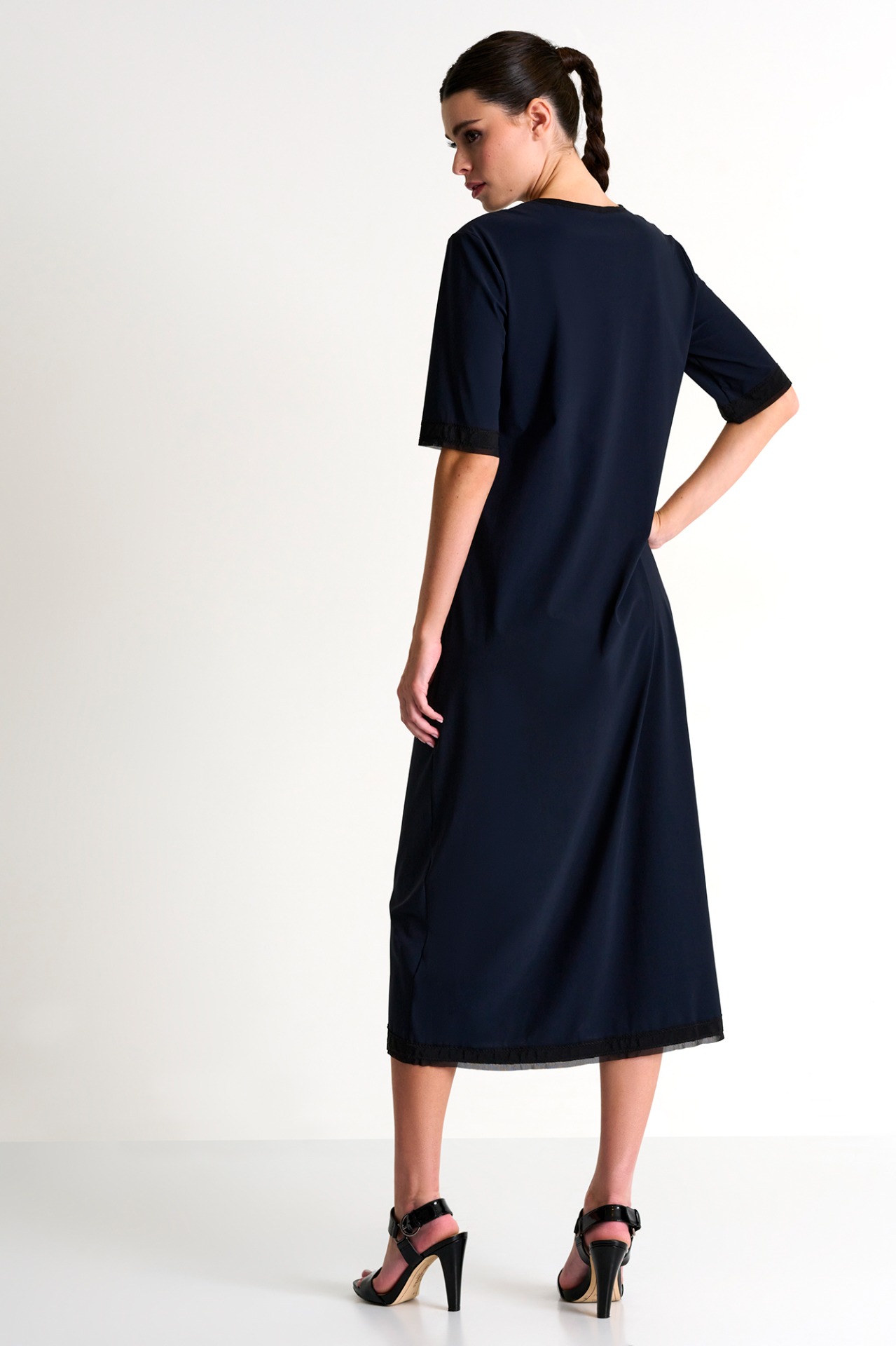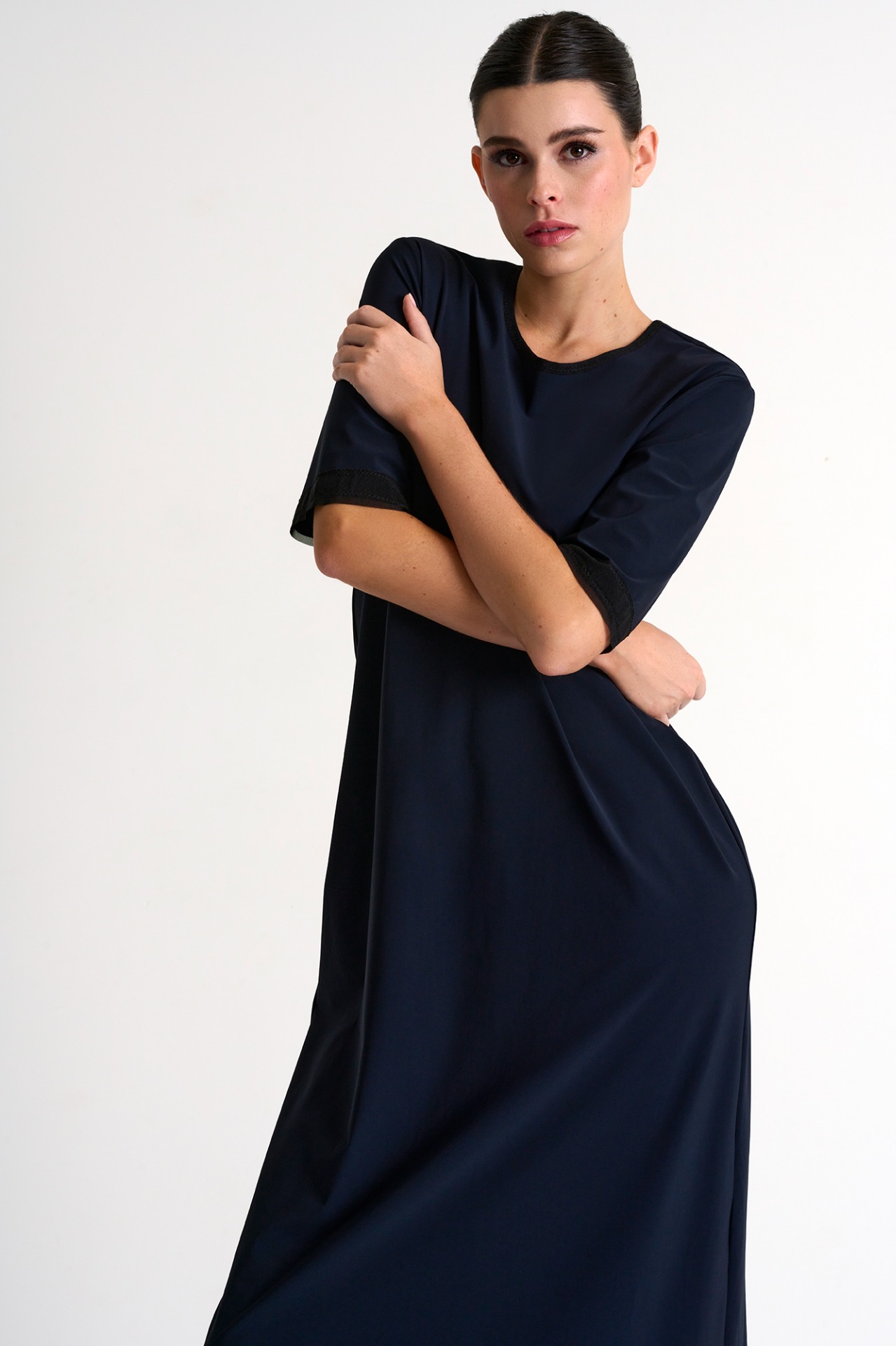 Cette robe longue versatile et confortable est dotée d'un col rond simple mais élégant et de manches courtes, idéale tant pour des occasions décontractées que pour des événements plus formels.