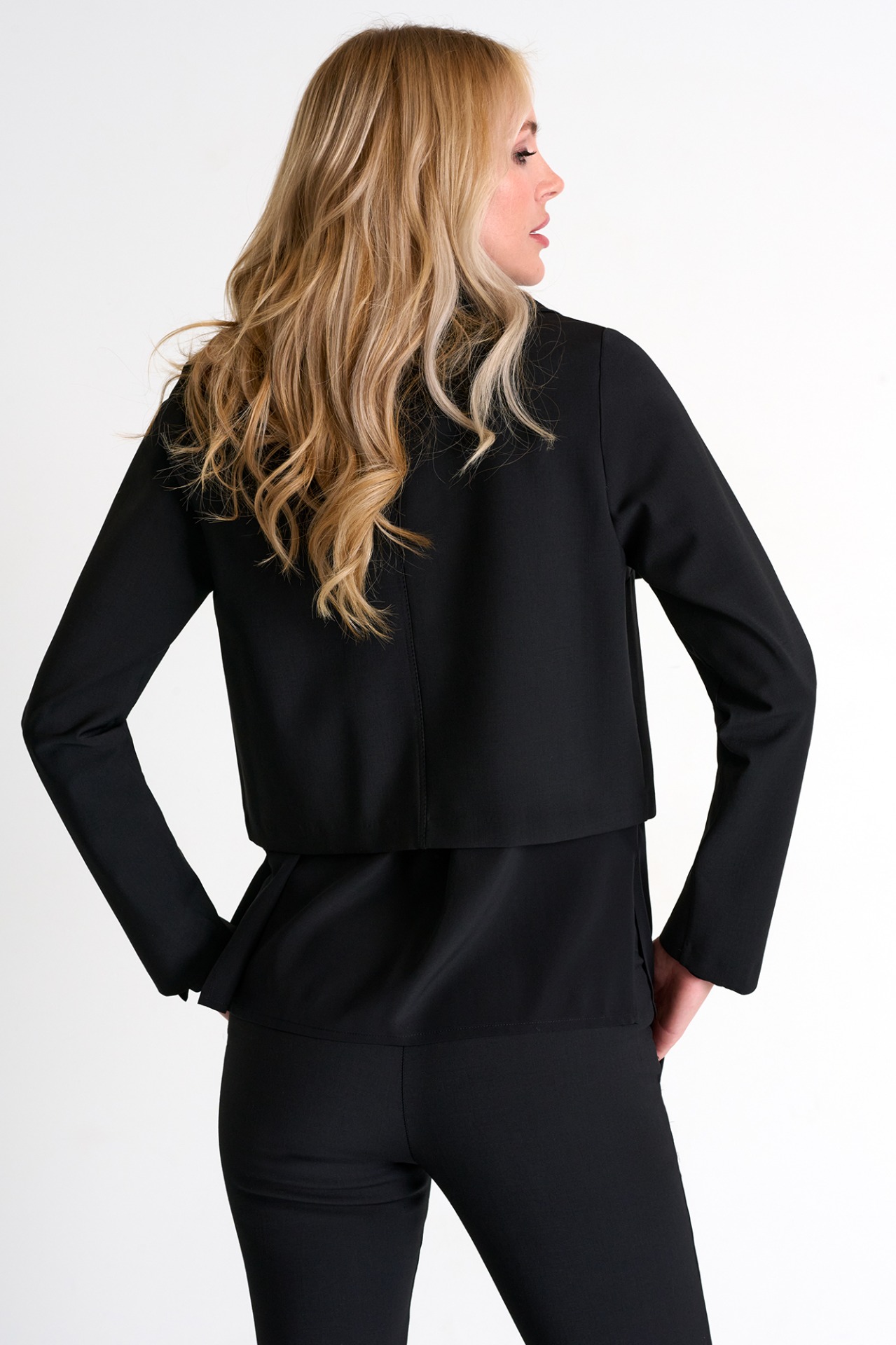 Ce veston court contemporain est munie d'une fermeture éclair argentée et de poches plaquées à rabat au buste pour un look structuré et professionnel. Il comprend une doublure apportant une touche de confort et de praticité.