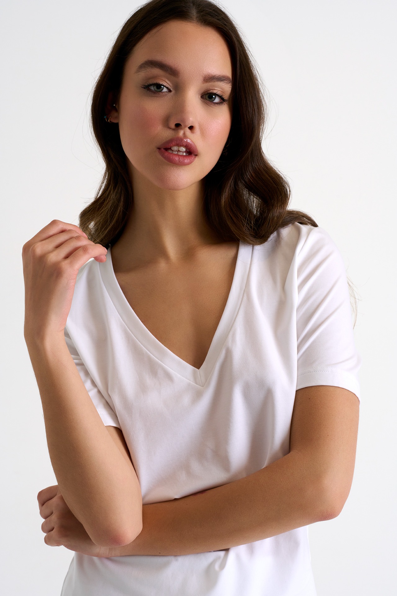 T-shirt en modal à col V, doux, extensible et léger, offrant un confort exceptionnel avec une coupe décontractée. Parfait pour un look minimaliste et polyvalent.