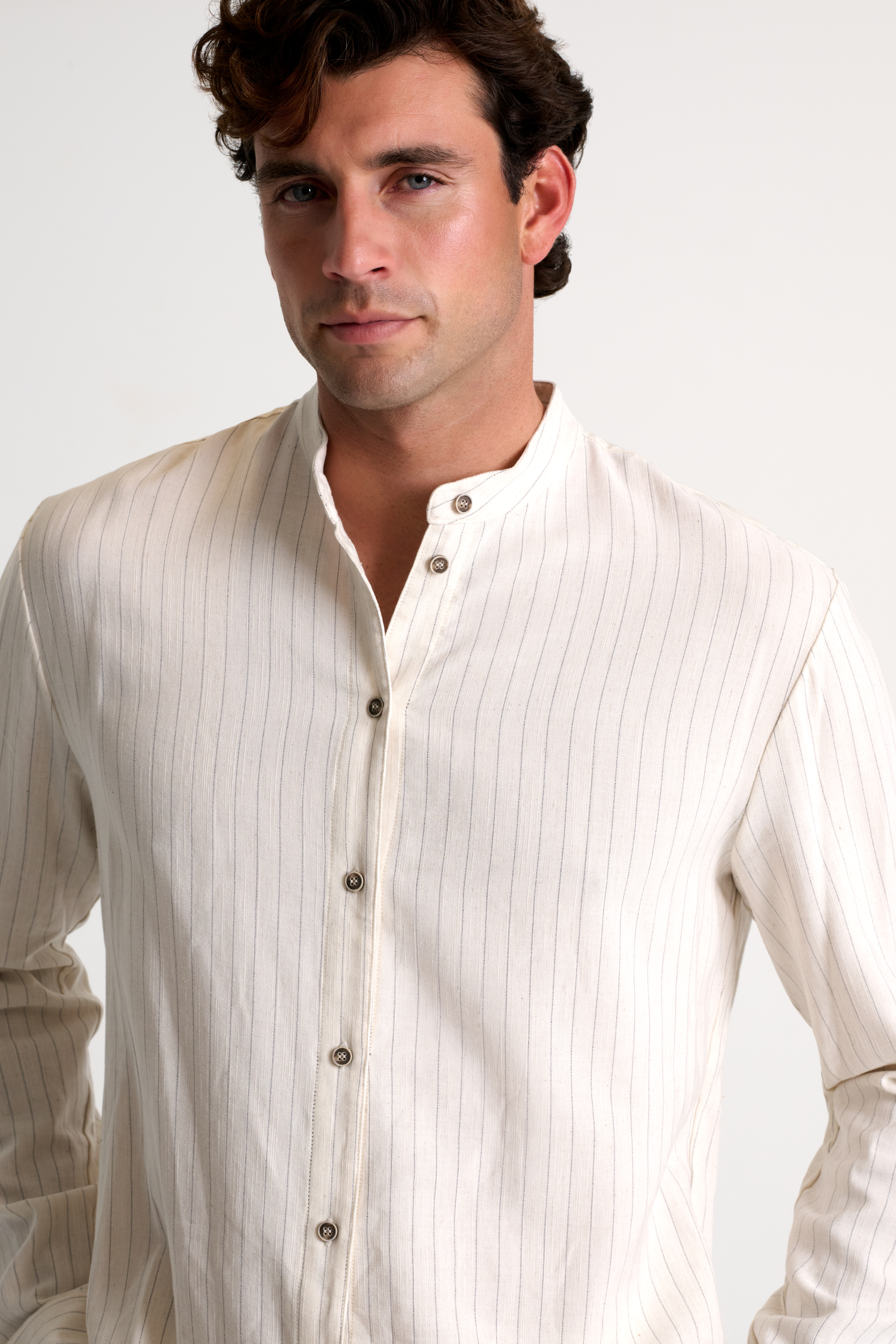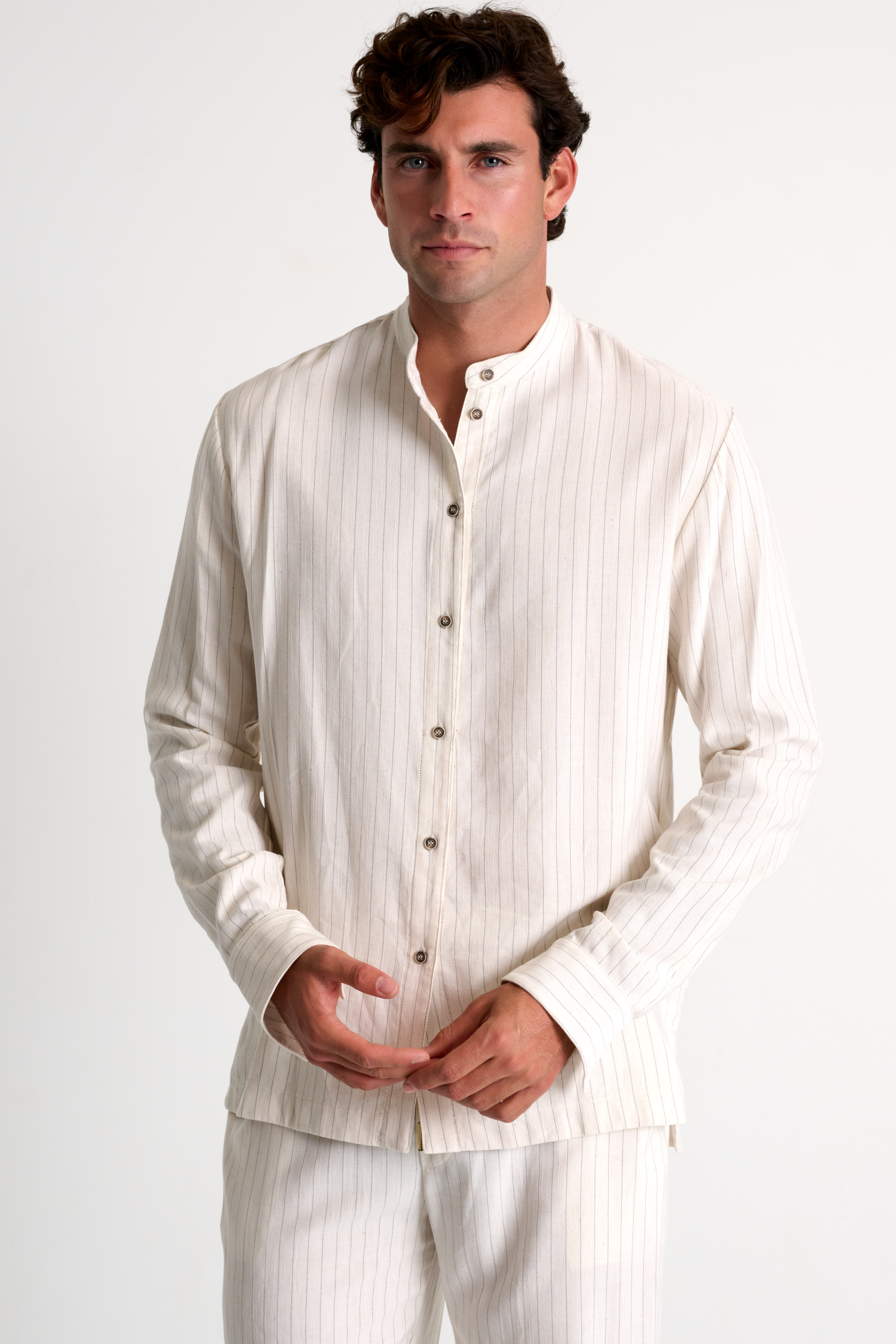 This long-sleeve linen shirt accentuated by a mandarin collar is elegant and easy to style with matching trousers.