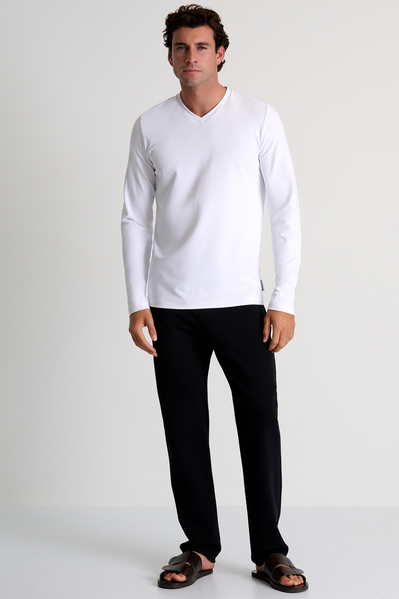 Ce manche long classique à col en V est parfait pour toutes les activités, avec son tissu respirant qui assure un confort tout au long de la journée.