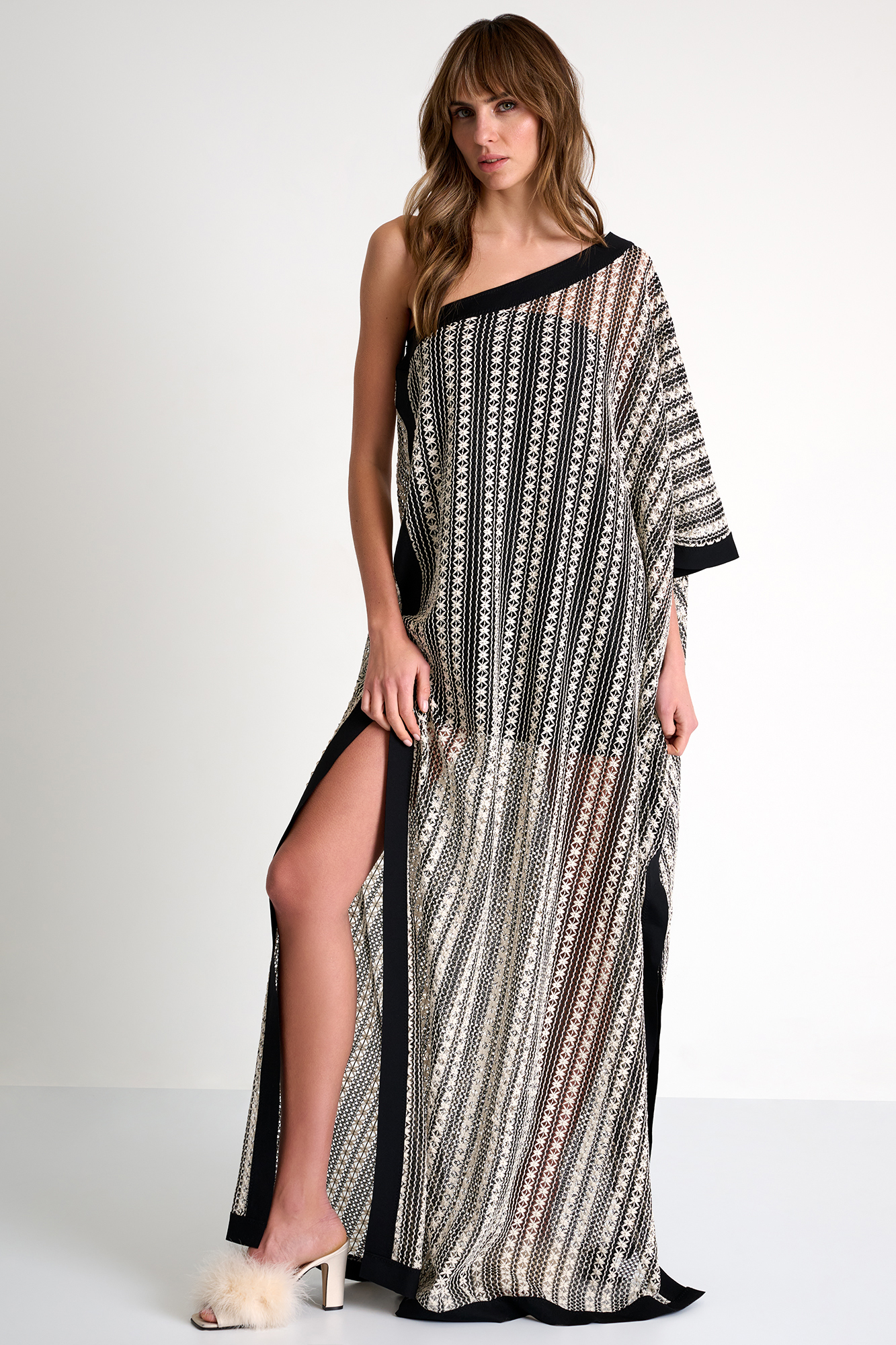 Bold yet refined, this maxi dress features a striking one-shoulder silhouette that subtly highlights the figure. The vertical embroidered motif adds texture and depth, while contrasting panels create a structured, modern balance.
