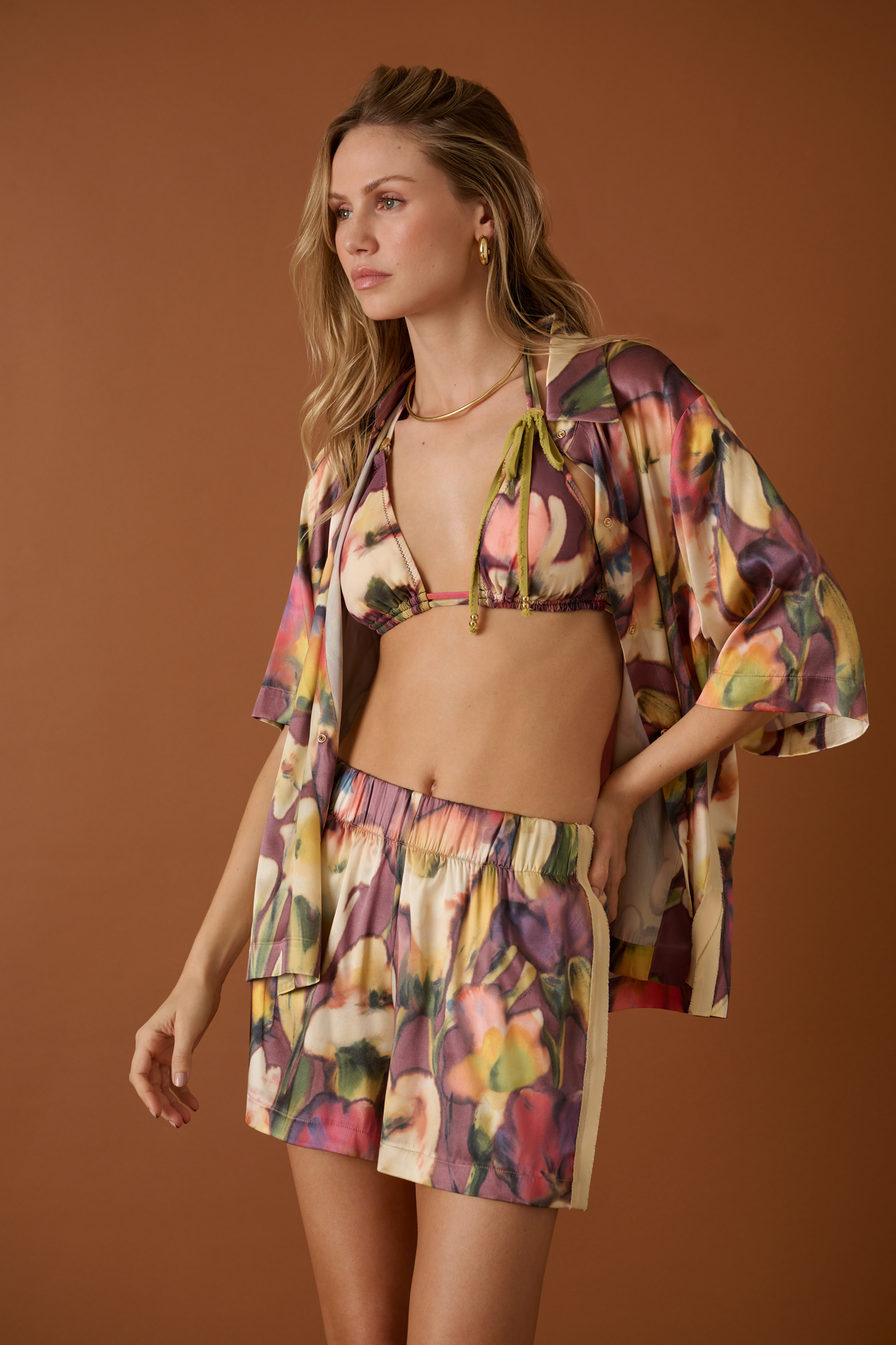 Silk shorts, soft and comfortable, with a wide elastic waistband and side pockets. This elegant short is perfect for layering over swimwear or for evening wear.