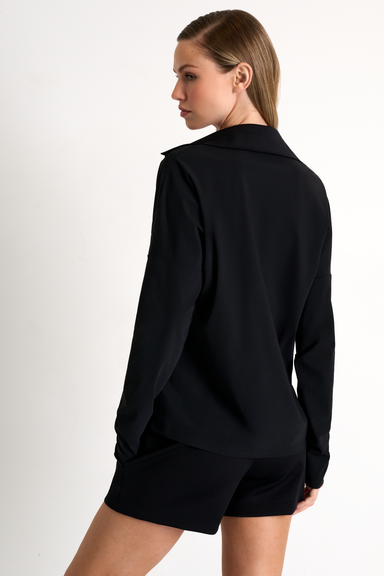 Crafted from a stretch fabric, this polo blouse delivers exceptional comfort and flexibility while maintaining a flattering silhouette.