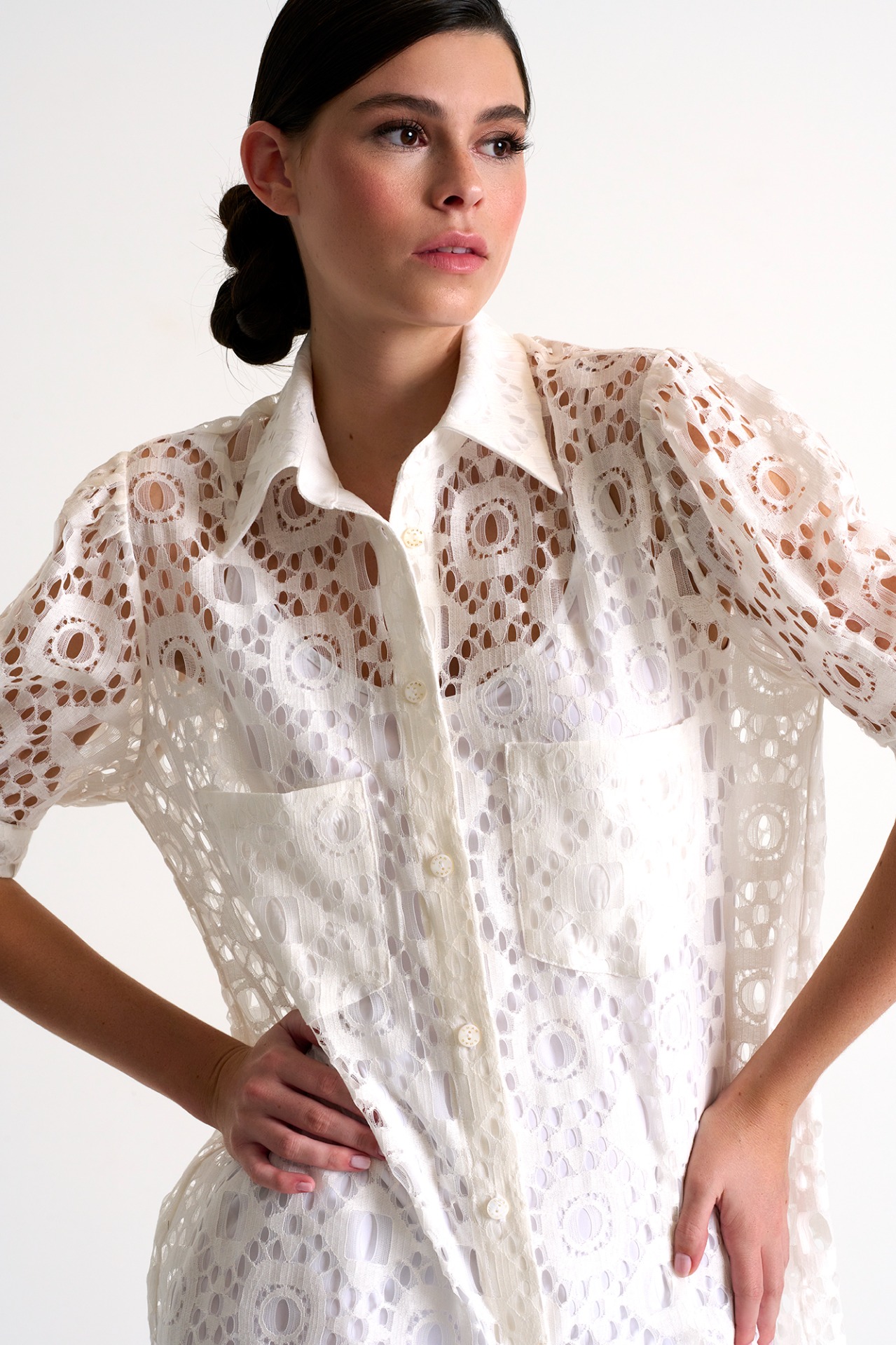 With delicate modern lace patterns, this charming dress features front pockets and elegant, short puff sleeves, complete with an included slip dress for added comfort. Its intricate details embody finesse and grace.