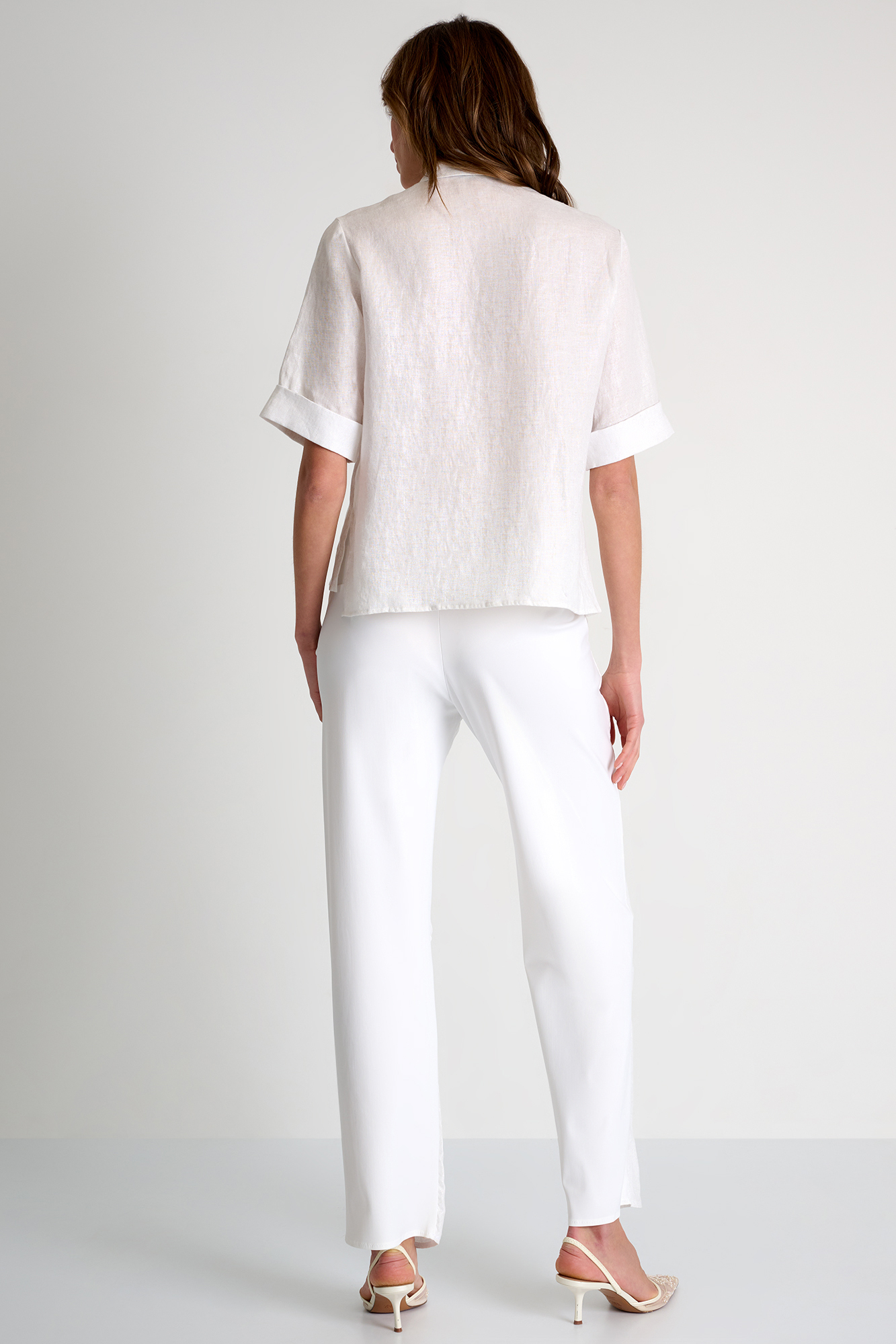 The purity of linen elevated with delicate luminosity. Crafted from a linen and Lycra blend, these pants combine breathable natural texture with comfortable stretch for effortless movement.