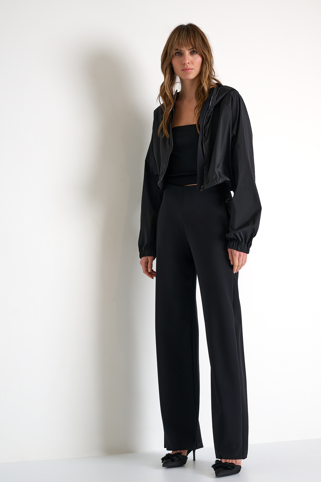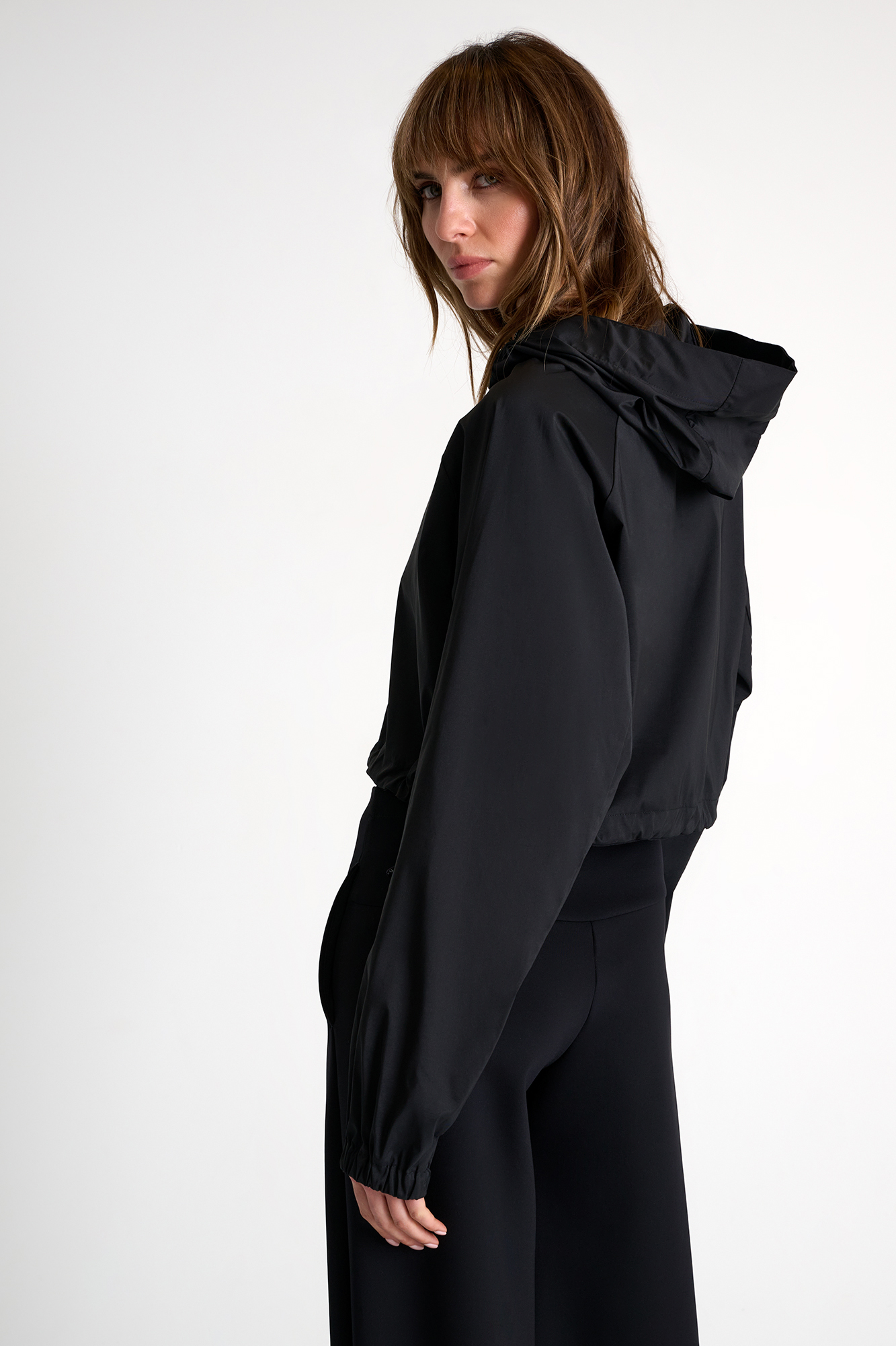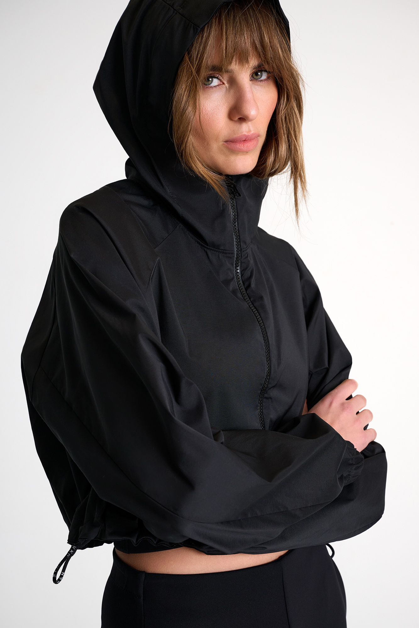 A modern essential with a refined edge. This cropped jacket features a clean silhouette enhanced by a lightweight technical fabric and a sleek front zipper. The relaxed volume and elasticized hem create effortless structure, making it the perfect layering piece for an elevated active or city look.